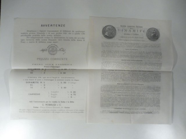 Due fogli pubblicitari su carta velina , il primo cm 23 x 29,5 con testo stampato al recto e al verso, il secondo cm 22 x 28 con testo stampato al solo recto, entrambi con piega orizzontale dovuta a ripiegatura del foglio. Pubblicita' della Societa' anonima italiana della dinamite con fabbrica presso Avigliana. Tratta di: specie di dinamite, qualita' della polvere, modo di adoperare la polvere, precauzioni da prendersi nei lavori sott'acqua, gli scoppi a vuoto, lo scoppio a cielo aperto, nelle grandi mine a forte carica, nei lavori sotterranei, nel carbone e nelle cave di pietra da taglio. Nel secondo foglio compaiono i prezzi.