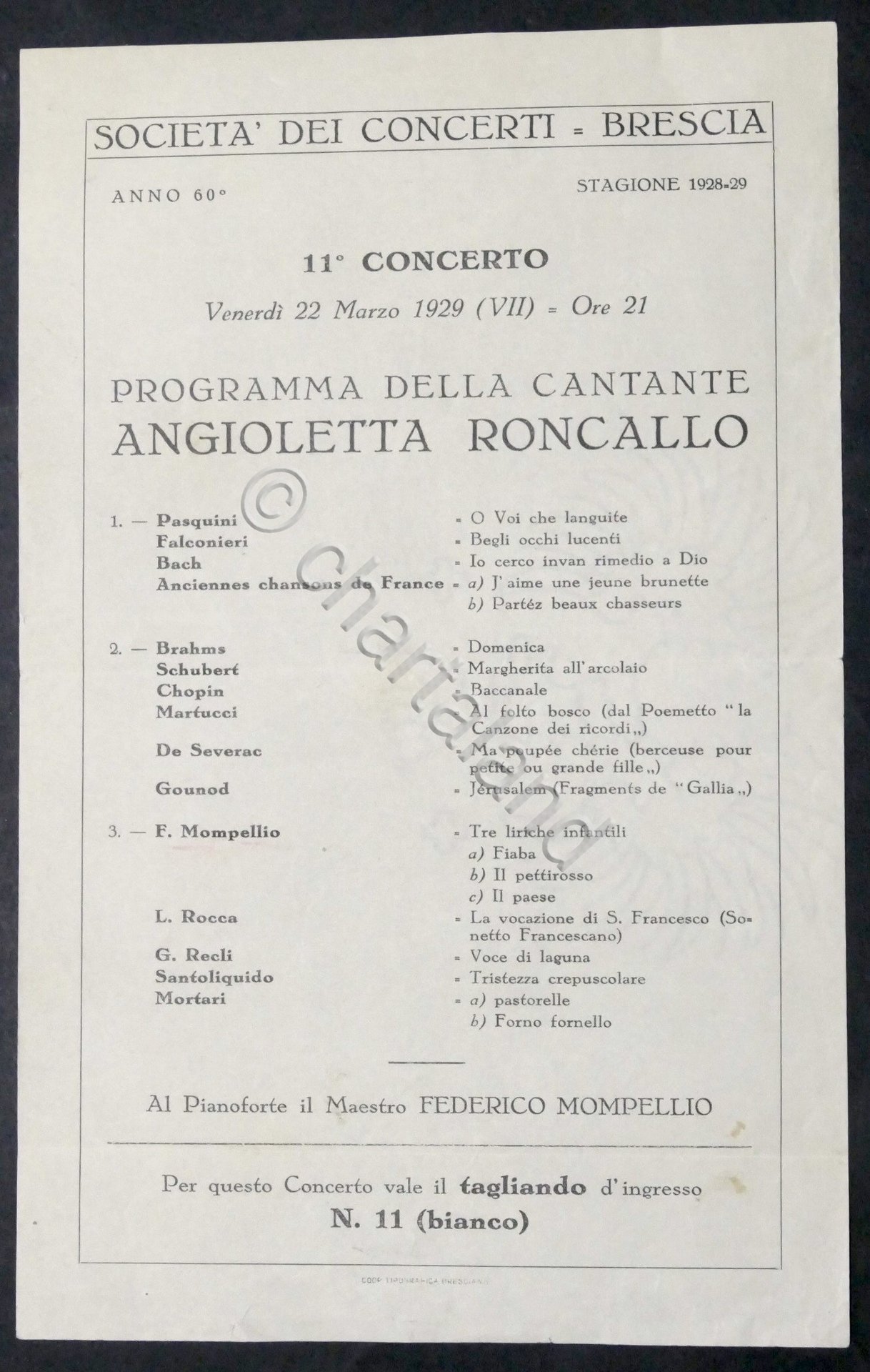 Società, dei Concerti Brascia - Concerto N. 11 - Programma della cantante Angioletta Roncallo - 1929