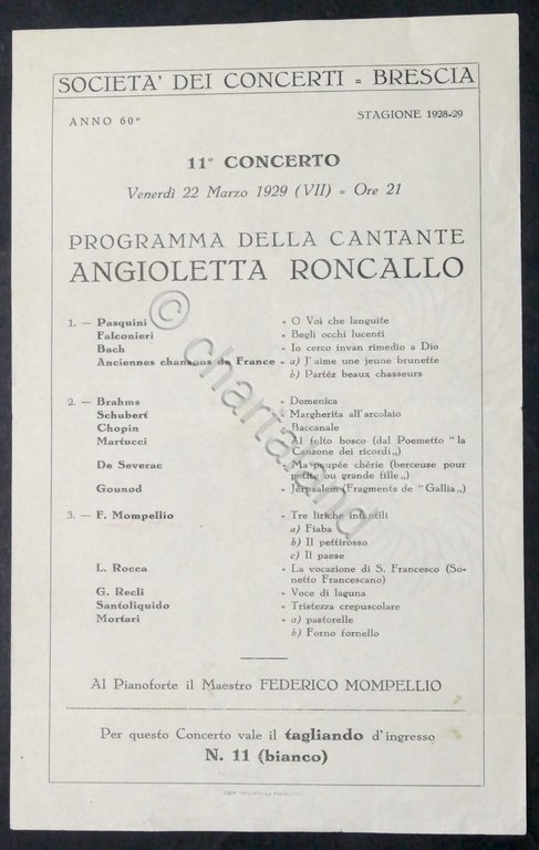 Società Concerti Brascia - Programma della cantante Angioletta Roncallo - 1929