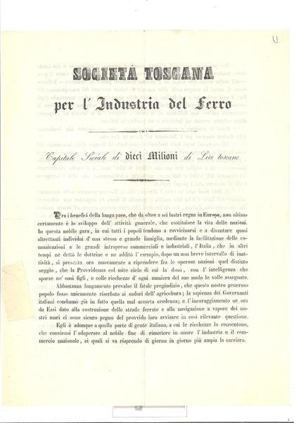DUE FOGLI VOLANTI ( cm.28 X 21 ). E' L'ATTO COSTITUTIVO DELLA SOCIETA' TOSCANA PER L'INDUSTRIA DEL FERRO. CAPITALE SOCIALE DI DIECI MILIONI DI LIRE TOSCANE. LA RESIDENZA DELLA DIREZIONE GENERALE E DELLA CASSA DELLA SOCIETA' E' SITUATA IN VIA MAGGIO N.1874 A FIRENZE, LE AZIONI IN VENDITA, ERANO PER LA COSTRUZIONE DEGLI STABILIMENTI DA ERIGERSI VICINO A LIVORNO. NELLA PARTE FINALE SONO ELENCATI I NOMI DEI SOCI FONDATORI. DUE STRAPPETTI LATERALI RICOMPOSTI, PER IL RESTO OTTIMA CONSERVAZIONE GENERALE.