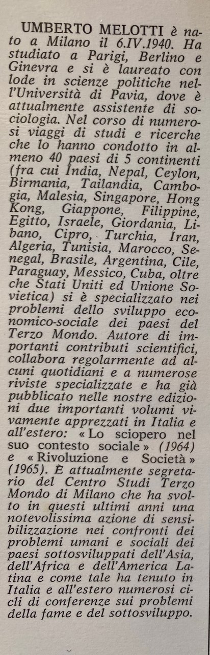 UMBERTO MELOTTI è nato a Milano nel 1940. Ha studiato a Parigi, Berlino e Ginevra e si è laureato con lode in scienze politiche nell'Università di Pavia, dove è attualmente assistente di sociologia. Nel corso di numerosi viaggi di studi e ricerche che lo hanno condotto in almeno 40 paesi di 5 continenti (fra cui India, Nepal, Ceylon, Birmania, Tailandia, Cambogia, Malesia, Singapore, Hong Kong, Giappone, Filippine, Egitto, Israele, Giordania, Libano, Cipro, Turchia, Iran, Algeria, Tunisia, Mo Marocco, Senegal, Brasile, Argentina, Cile, Paraguay, Messico, Cuba, oltre che Stati Uniti ed Unione Sovietica) si è specializzato nei problemi dello sviluppo economico-sociale dei paesi del Terzo Mondo. Autore di importanti contributi scientifici, collabora regolarmente ad alcuni quotidiani e a numerose riviste specializzate e ha già pubblicato nelle nostre edizioni due importanti volumi vivamente apprezzati in Italia e all'estero: Lo sciopero nel suo contesto sociale 1964 e Rivoluzione e Società 1965. E attualmente segretario del Centro Studi Terzo Mondo di Milano che ha svolto in questi ultimi anni una notevolissima azione di sensibilizzazione nei confronti dei problemi umani e sociali dei paesi sottosviluppati dell'Asia, dell'Africa e dell'America Latina e come tale ha tenuto in Italia e all'estero numerosi cicli di conferenze sui problemi della fame e del sottosviluppo.