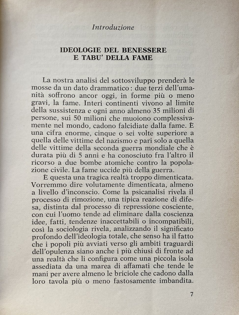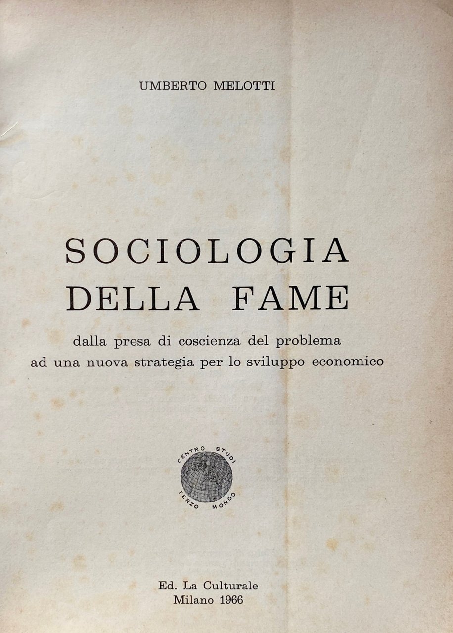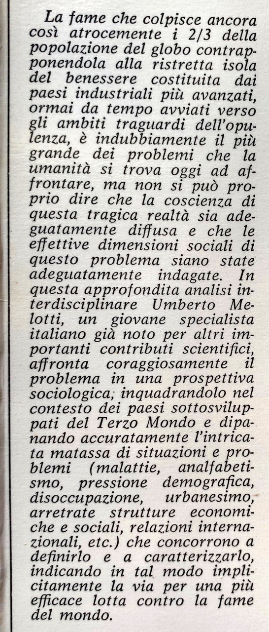 La fame che colpisce ancora così atrocemente i 2/3 della popolazione one del globo contrapponendola alla ristretta isola del benessere costituita dai paesi industriali più avanzati, ormai da tempo avviati verso gli ambiti traguardi dell'opulenza, è indubbiamente il più grande dei problemi che la umanità si trova oggi ad affrontare, ma non si può proprio dire che la coscienza di questa tragica realtà sia adeguatamente diffusa e che le effettive dimensioni sociali di questo problema siano state adeguatamente indagate. In questa approfondita analisi interdisciplinare Umberto Melotti, un giovane specialista italiano già noto per altri importanti contributi scientifici, affronta coraggiosamente il problema in una prospettiva sociologica, inquadrandolo nel contesto dei paesi sottosviluppati del Terzo Mondo e dipanando accuratamente l'intricata matassa di situazioni e problemi (malattie, analfabetismo, pressione demografica, disoccupazione, urbanesimo, arretrate strutture economiche e sociali, relazioni internazionali.) che concorrono a definirlo e a caratterizzarlo, indicando in tal modo implicitamente la via per una più efficace lotta contro la fame del mondo.