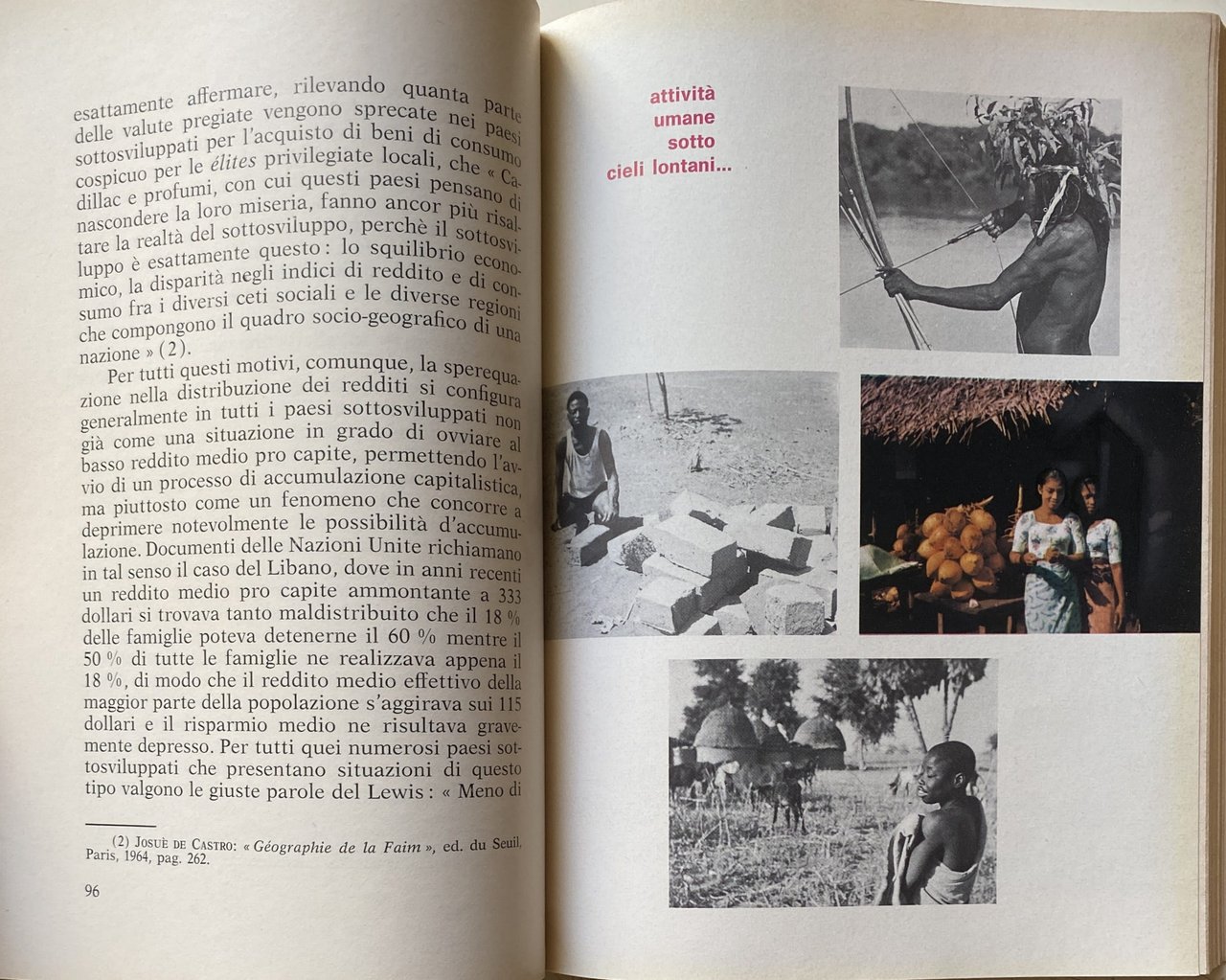 Soggetti: Sociologia Scienze sociali Studi culturali Economia Capitalismo Marxismo Sviluppo economico Sfruttamento Bambini Denutrizione Malnutrizione Fame Sottosviluppo Terzo mondo Concezione marxiana Lotta di classe Risorse Imperialismo Colonialismo Africa Asia Europa America Latina Schiavitù Servitù della gleba Tabù Benessere Alimentazione Cibo Calorie Carenze nutrizionali Nutrizione Proteine Vitamine Deficit Fabbisogno Malattie Starvation Dieta Distribuzione Demografia Famiglie Figli Industrializzazione Dipendenza Terziario Manodopera Donne Diritti umani Inferiorità Razzismo Parità Genere Lavoro Disoccupazione Emigrazione Monoculture Biodiversità Mercato Esportazioni Carestie Morte Approvvigionamento Gruppi di pressione interesse Governo Multinazionali Condizionamento Classe media Materie prime Parassitismo Dittatori Sussistenza Sopravvivenza Dittatura Commercio Solidarietà Analfabetismo Urbanizzazione Metropoli Sanità Problemi sociali Occidente Minerali AIDS Infezioni Colera Natalità Mortalità Rachitismo Anemia Vaccini Medicine Epidemie Vaiolo Lebbra Tenia Igiene Framboesia Malattie endemiche Malaria Zanzare Profilassi Terzana Peste Amebiasi Verminosi Penicillina Antibiotici Farmaci Tubercolosi Tifo Astenia Tracoma Febbre gialla Periferie Bidonville Favelas Ghettizzazione Morros Embargo Hambre Statistiche Documenti Dati Bibliografia Riferimento Agricoltura Analisi Anti-Dühring Società asiatica Acqua Avineri Borghesia Collettivismo burocratico centralizzato Cina Civiltà cinese coloniale Das Kapital Dhoquois Egitto etnocentrico Europa Esistenza Feudale Friedrich Engels Godelier Grundrisse Hegel Ideologia India Industriale Irrigazione Capitale Karl Marx Terra Lavoro Marxista Produzione Natura Organizzazione Dispotismo orientale Contadini Plekhanov Politica Proprietà privata Forze produttive Proletariato Rapporti Rivoluzione Dominio India Sochinenya Socialismo Formazione Trotsky Lenin Vera Zasulich Comunità Villaggio Werke West Wittfogel Daily Tribune Zasulich Max Weber Maoismo Guerre Anni Sessanta Collezionismo Libri Vintage fuori catalogo Bibliografia Fonti ONU FAO Libri illustrati Ceti privilegiati Ricchezza Miseria Povertà Divario Salario Debito Geopolitica Mannheim Josué De Castro Geografia Arthur Lewis Beriberi Brasile Fertilità Latifondismo Porto Rico Pellagra Scorbuto John Boyd-Orr Zucchero Caffè Famine Sud Bangladesh Filippine Indonesia Pakistan Nigeria Congo Nepal Ceylon Repubblica Dominicana Salvador Ghana Argentina Nicaragua Cuba Egitto Sudan Reddito pro-capite Senegal Tailandia Vietnam Cambogia Poligamia Corruzione Senegal Colombia Venezuela Petrolio Tribali Tribù Patriarcato Violenza Ruoli Istituzioni Stato Georges Balandier Emancipazione femminile Status Corporazioni Imprenditoria Angelo Pagani Compradora Marocco Angola Cile Medio Oriente Unione Sovietica René Dumont GATT UNESCO Massimo Astrua Piero Gheddo Luciano Gallino Guido Galeotti Yves Lacoste Pierre Bourdieu Paul Sweezy Leo Huberman Roger Murray Kavalam Pannikar Enrica Collotti Pischel Edgar Snow Jean Chesneaux Gabriel Ardant Gilbert Etienne Gunnar Myrdal Paul Baran Colin Clark Vittorio Marrama Sylos Labini Kenneth Galbraith Pianificazione Corea Perroux Tabacco Piantagioni Riso Cotone Juta Miniere Cacao Tè Banane Caucciù Arachidi Mais Kakar Calcutta Bombay Brazzaville Rio de Janeiro Messico Hong Kong Perù Honduras Siria Iran Iraq Algeria Recife Porto Alegre Vibrione Koch Sociology Social sciences Cultural studies Economics Capitalism Marxism Economic development Exploitation Children Undernutrition Malnutrition Hunger Underdevelopment Third world Class struggle Resources Colonialism Slavery Serfdom Taboo Wellbeing Nutrition Food Calories Nutritional deficiencies Nutrition Proteins Vitamins Requirements Diseases Starvation Diet Distribution Demography Families Children Industrialization Dependence Tertiary Labor Women Human rights Inferiority Racism Equality Gender Work Unemployment Emigration Biodiversity Market Exports Death Supply Pressure groups interest Government Multinationals Conditioning Middle class Raw materials Parasitism Dictators Subsistence Survival Dictatorship Commerce Solidarity Illiteracy Urbanization Metropolis Healthcare Social problems West Minerals Infections Cholera Birth rate Mortality Rickets Vaccines Medicines Epidemics Smallpox Leprosy Tapeworm Hygiene Yaws Endemic diseases Mosquitoes Prophylaxis Plague Amebiasis Verminosis Antibiotics Drugs Tuberculosis Typhus Asthenia Trachoma Yellow fever Suburbs Ghettoization Statistics Documents Data Bibliography Reference Agriculture Analysis Water Bourgeoisie Centralized bureaucratic collectivism China Colonial Chinese civilization Ethnocentric Egypt Europe Existence Ideology India Industrial Irrigation Land Work Production Nature Organization Oriental despotism Peasants Politics Private property Productive forces Proletariat Relationships Revolution Domination Socialism Community Training Village Wars 1960s Collecting Out of print books Bibliography Sources Illustrated books Privileged classes Wealth Poverty Wage gap Debt Geopolitics Geography Brazil Fertility Landlordism Puerto Rico Pellagra Scurvy Sugar Coffee Southern Philippines Indonesia Dominican Republic Egypt Sudan Per Capita Income Thailand Cambodia Polygamy Corruption Senegal Oil Tribals Tribes Patriarchy Violence Roles Institutions State Women's Empowerment Status Corporations Entrepreneurship Morocco Chile Middle East Planning Korea Tobacco Plantations Rice Cotton Jute Mining Cocoa Tea Bananas Rubber Peanuts Corn Mexico Syria