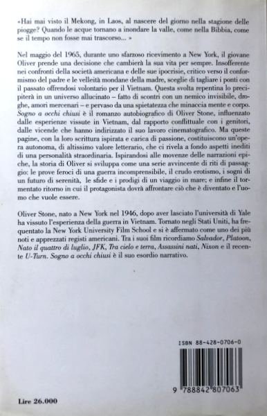 Soggetti: Letteratura Straniera, Narrativa americana, Cinema, Registi americani, Biografie romanzate, Autobiografie, Romanzi autobiografici, Esperienze, Vietnam, Anni giovanili, Volontariato, Soldati, Laos, Guerra, Stati Uniti, Mekong, Vietcong, Formazione, Riti di passaggio, Gioventù, Contestazione, Libri Vintage, Fuori catalogo, College, Yale, New York, Mei Line, Apocalypse Now, Morte, Erotismo, Passione, Ivy League, Droghe, Campi di sterminio, Viaggio epico, Martin Scorsese, Merchant Marine, Marina Mercantile, Mexico, Inconscio, Psychedelic drugs, Arruolamento nell'esercito, Anni Sessanta, Anni Settanta, Natural Born Killers, JFK, Scarface, Foreign Literature, American Fiction, Cinema, American Directors, Fictional Biographies, Autobiographies, Autobiographical Novels, Experiences, Vietnam, Youth Years, Volunteering, Soldiers, War, United States, Education, Rites of Passage, Youth, Contestation, Out of print Books, Death, Eroticism, Passion, Extermination camps, Epic journey, Unconscious, Army recruitment, Sixties, Seventies, Memorie, Memories