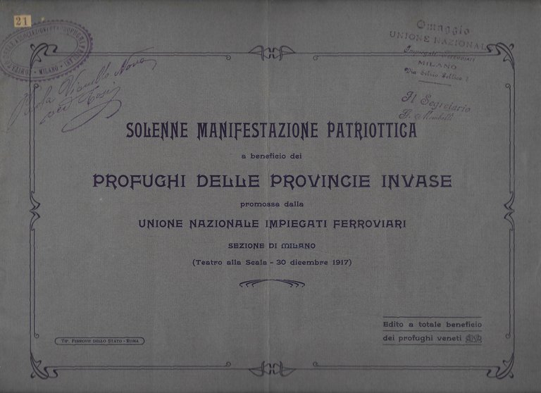 Solenne manifestazione patriottica a beneficio dei profughi delle provincie invase promossa dalla Unione Nazionale Impiegati Ferroviari. Sezione di Milano