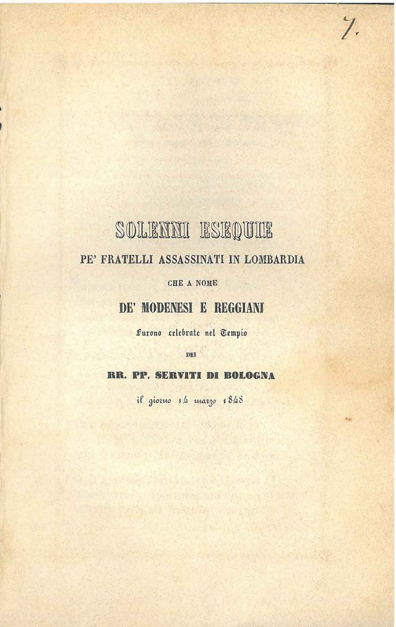 Solenni esequie pe' fratelli assassinati in Lombardia che a nome de' modenesi e reggiani furono celebrate nel tempio dei RR. PP. Serviti di Bologna il giorno 14 marzo 1848