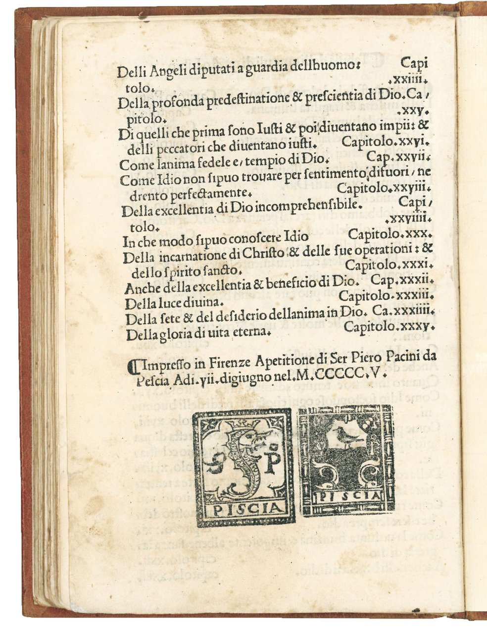 Soliloquii del Divo Padre Sancto Augustino volgari. Colophon: Impresso in Firenze Apetitione di Ser Piero Pacini da Pescia Adi. vii. digiugno nel. M.CCCCC.V.