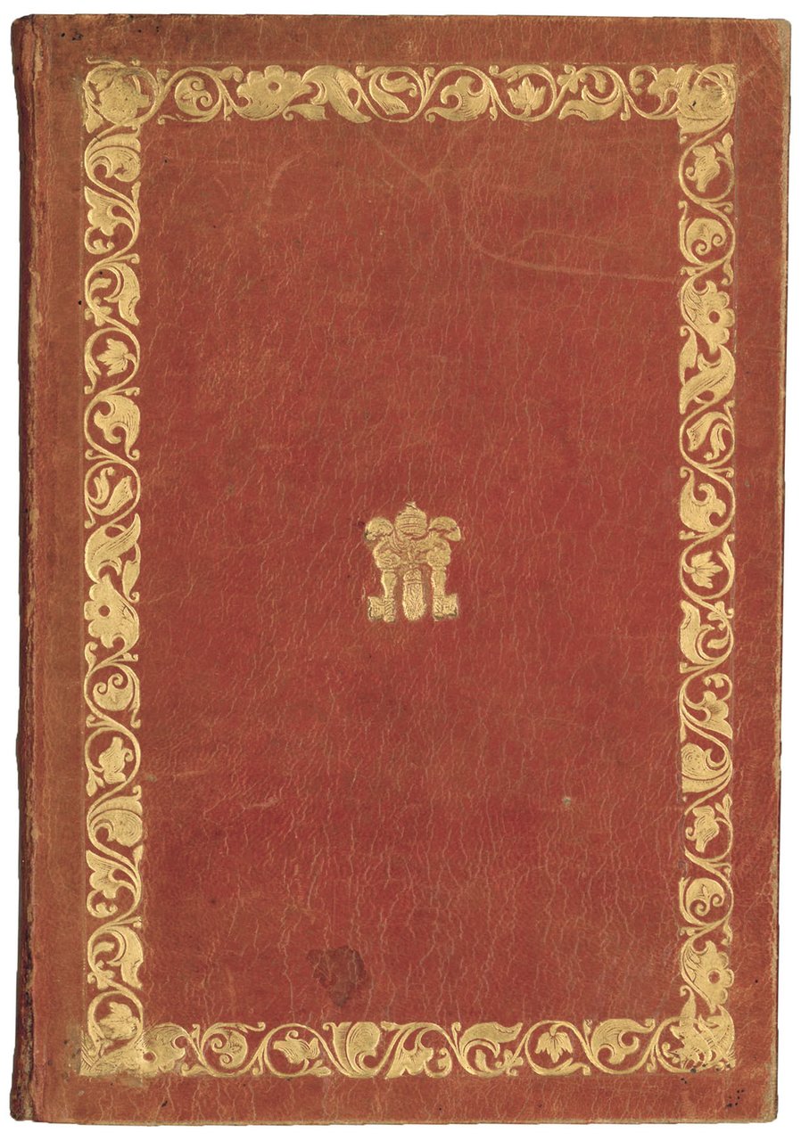 4to (194x132 mm). [34] leaves. Collation: a-c8 d6 e4. Woodcut vignette of St Augustine kneeling before the Virgin and Child on a throne on l. a1r. Colophon and double Pacini's woodcut device on last leaf verso. Woodcut decorative initials on black ground. Roman type. Decorative 19th-century binding in orange calf with gilt roll-border on covers and small papal device at the center, color paper endleaves (slightly worn and rubbed). Small marginal hole to l. a6 not affecting the text, some occasional minor foxing, all in all a good copy.