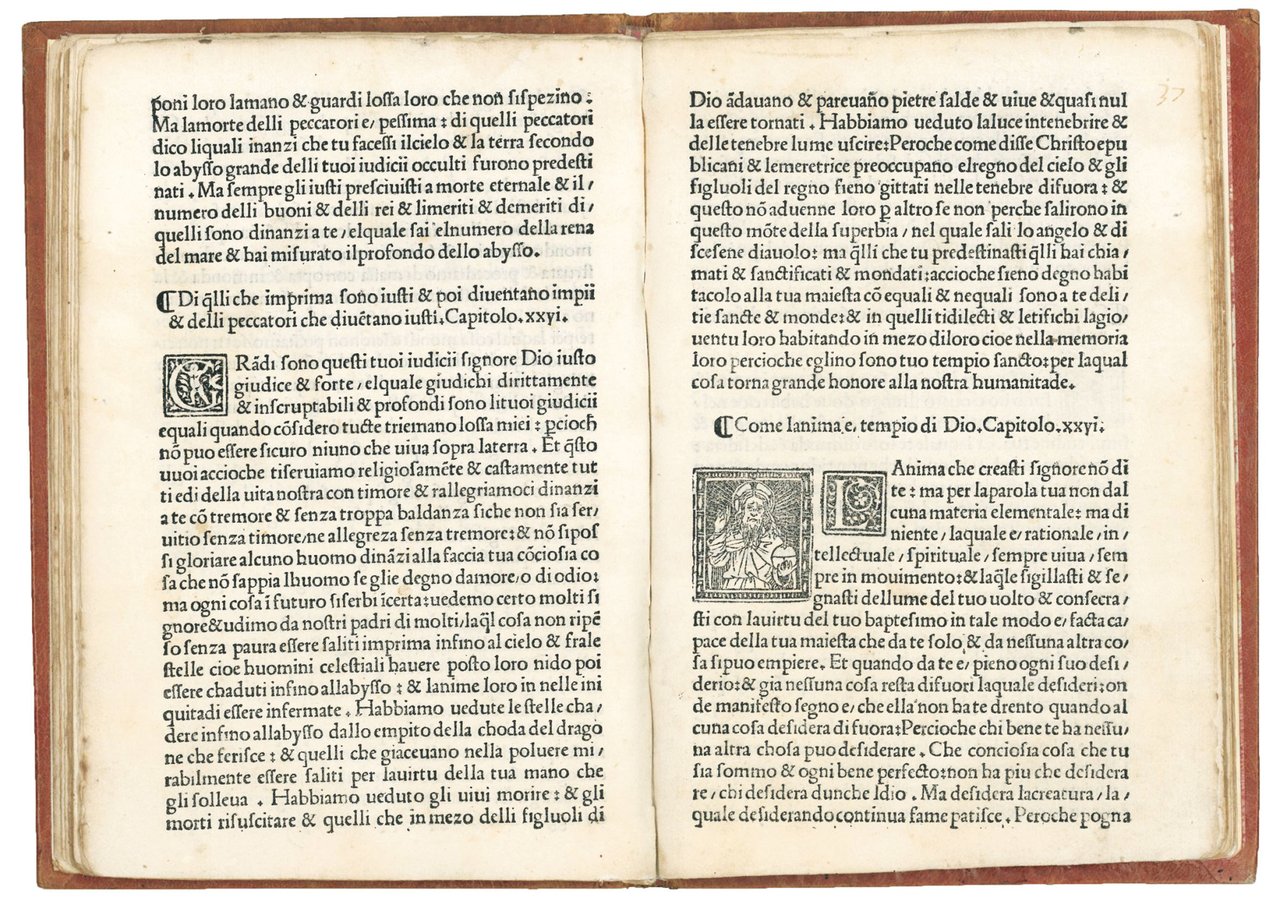 Rare early Florence edition, a reprint of the 1496 Pacini edition, of this Italian translation of the apocryphal Soliloquia, a dialogue which describes St Augustine's state of mind between his conversion and baptism, containing a discussion of wisdom and the immortality of truth. In the later Middle Ages, Augustine's original text of the Soliloquia (‘Discourses on God and the immortality of the soul') was virtually forgotten, and in its place a different and more mystical pseudo-Augustinian Soliloquia, composed in the thirteenth century, in the form of a confession, began to gain popularity. Of all St Augustine's apocryphal texts, this one was the most successful in Italy and in France. The Soliloquia was translated into Italian three times in the fourteenth and fifteenth centuries and, although the translation remains anonymous, it is traditionally attributed to Fra Agostino da Scarperia, and it was certainly made in an Augustinian milieu.