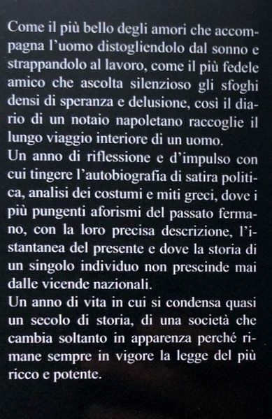 As the most beautiful of the loves that accompanies the man leading him away from sleep and off to work, as the most loyal friend who listens to quiet the outbursts filled with hope and disappointment, like the diary of a notary napoletano collects the long inner journey of a man. A year of reflection and impulsively with which dye the autobiography of political satire, analysis of costumes and Greek myths, where the most pungent aphorisms of the past, with their precise description, the snapshot of the present and where the story of a single individual is without prejudice ever from national events. One year of life in which condenses almost a century of history, of a society that changes only in appearance because it always remains in force the law of the rich and powerful.