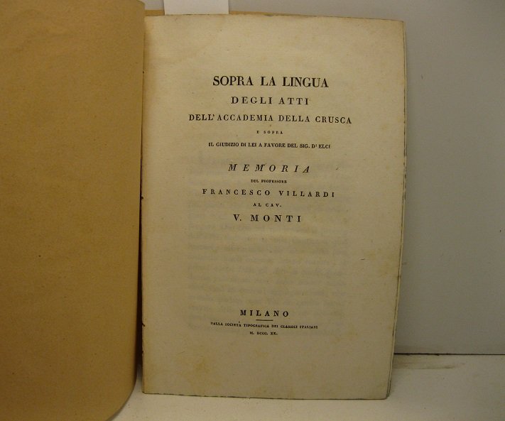 Sopra la lingua degli atti dell'Accademia della Crusca e sopra il giudizio di lei a favore del Sig. d'Elci. Memoria al cav. V. Monti