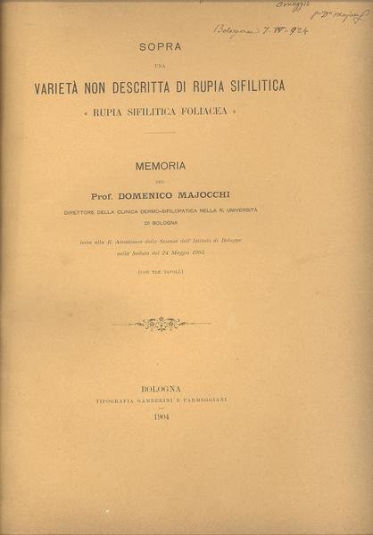 IN 4°, pp.44. LEGATURA D'EPOCA CON DORSO IN TELA E TITOLO IN ORO, PIATTI RIGIDI MARMORIZZATI CON TRE TAVV. f.t. a col. MEMORIA DEL PROF. MAJOCCI DIRETTORE DELLA CLINICA DERMO-SIFILOPATICA NELLA R. UNIVERSITA' DI BOLOGNA, LETTA ALLA R. ACCADEMICA DELLE SCIENZE DELL'ISTITUTO DI BOLOGNA NELLA SEDUTA DEL 24 MAGGIO 1904. DEDICA MANOSCRITTA AL FRONTESPIZIO NELLA PARTE IN ALTO A DESTRA. OTTIMA CONSERVAZIONE. ID, 6335