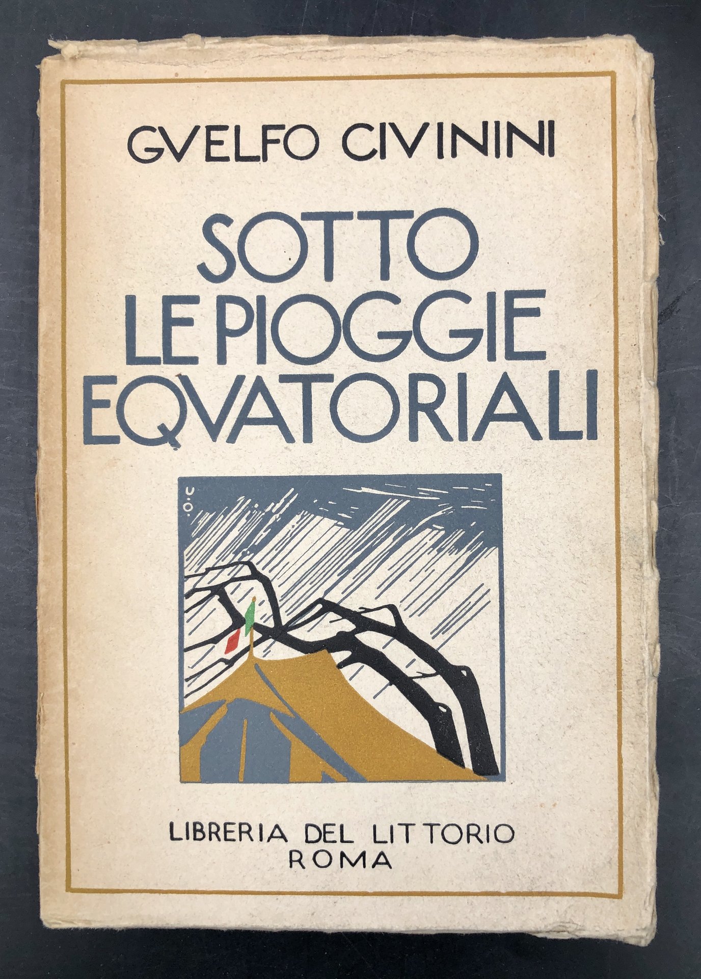 In-8° (cm. 19,9), pp. 216 + 1 CARTA RIPIEGATA b.n. f.t. Bross. edeit., bel DISEGNO a COLORI firmato U.O. in cop. piccola mancanza e fessurina al dorso brunito ma compatto, ma buon es In Africa orientale da Addis Abeba a Gambela alla ricerca dei resti dell'esploratore Vittorio Bottego, caduto nel 1897; con aiuti di Balbo, e del principe Marescotti-Ruspoli che l'accompagnò. CIVININI, giornalista audace amante del combattimento, con gli Arditi, a Fiume, nazionalista e poi fascista, esploratore (nel 1924 aveva realizzato il primo documentario cinematografico in una spedizione dall'Eritrea al Lago Tana. Non comune e gran lettura.
