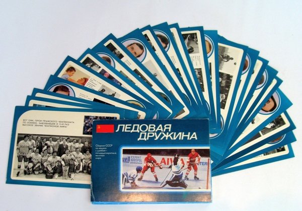 Twenty-three oversized hockey cards representing the players and staff of the 1979 Soviet national ice hockey team. Fans of any language who watched the epic 1972 Canada-Russia series will easily recognize such famous players as Vladislav Tretiak, Valeri Kharlamov, Boris Mikhailov, and many others, not to mention their omnipresent coach Viktor Tikhonov. Each card measures 21 x 15cm with colour and black and white photos plus text on one side and considerable text on the back. We repeat, all text is in Russian. The cards come packaged in a two-fold colour outer wrap. Clean and unmarked with light wear. A wonderful and uncommon memento of the glory days of Soviet ice hockey. Book