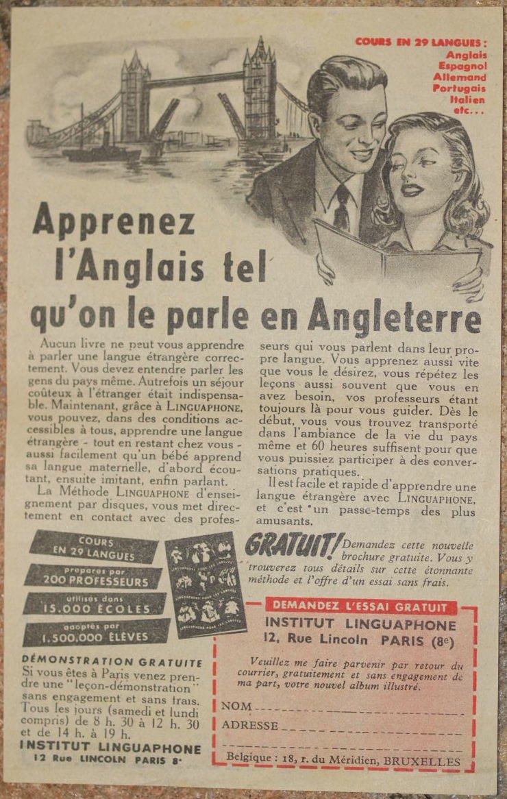In 16. Dim. cm 16,5x10,5. Pp. (2). Interessante depliant pubblicitario per la richiesta di informazioni della scuola per disegno Ecole ABC di Parigi e l'Institut Linguaphone di Parigi per imparare l'inglese. In buone condizioni, piegature. Interesting advertising depliant pubblicitario for the request of information of school of drawing Ecole ABC in Paris and the Institut Linguaphone in Paris to learn english. In good conditions, foldings.
