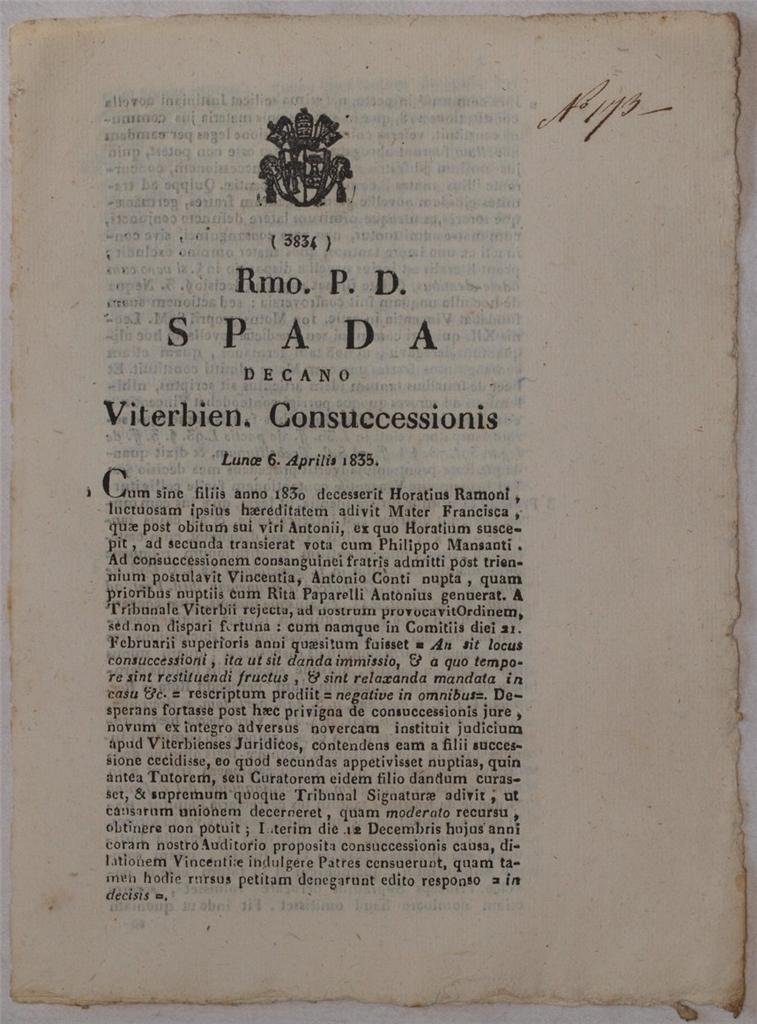 SPADA DECANO VITERBIEN CONSUCCESSIONIS LUNOE 6 APRILIS 1835