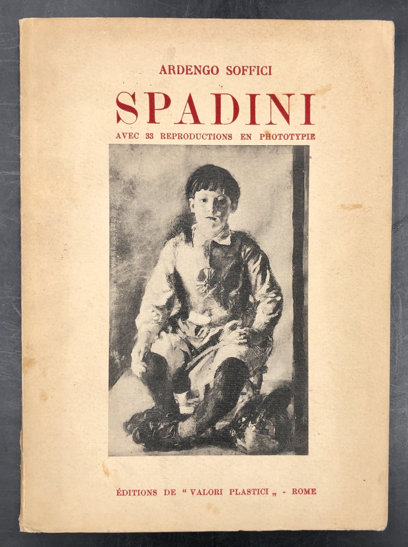 In-16° (cm. 19,5 x 14), pp. 14, (2b) + 33 TAVOLE di riproduzioni in bianco e enro fuori testo. Cartoncino editoriale illustrato. Le pagiine di testo, in francese, sono su bella carta nelle loro barbe. Le tavole riprodotte in accurate fototipie opache in biano e nero sono su carta a bordi dritti editorale. SPADINI (Firenze 1883 - Roma 1925), pittore della "Scuola Romana", a Roma conobbe il critico Emilio Cecchi, che lo considerava uno dei più valenti pittori del nuovo secolo e con il quale frequenta l'ambiente di letterati e artisti che si riuniscono al caffè Aragno di via del Corso. Nel 1924 ebbe una sala personale, con 37 opere, alla XIV Biennale di Venezia. SOFFICI nel 1913, con Papini, fondò la rivista Lacerba, organo ufficiale del futurismo,che però abbandonò per il cubismo nel 1914, ma nel 1919 con Papini fondò la rivista "La Vraie Italie". Il Soffici che aveva fatto conoscere agli amici fiorentini Cézanne, i cubisti e Apollinaire, e che aveva espresso e ravviato l'entusiasmo per Rimbaud, ripiega verso uno stile decoroso e foscoliano classico. La rivista VALORI PLASTICI, per la diffusione delle idee estetiche della pittura metafisica e delle correnti d'avanguardia europea, fu edita in 15 numeri dal 1918 al 1921, e questo quaderno in francese conerma le nuove importanti iniziative, specialmente fuori dall'Italia.