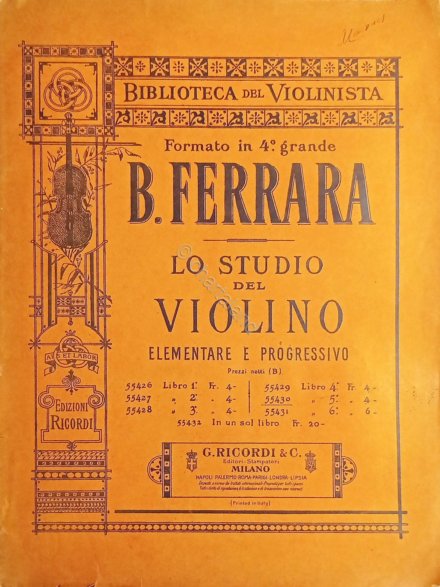 Spartiti - B. Ferrara - Lo Studio del Violino Elementare e Progressivo - Libro Quinto - 1900 ca. Ricordi Formato grande. Pagine 50 ca. Condizioni molto buone.
