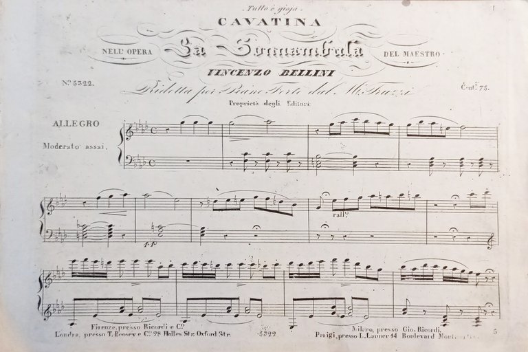 Spartiti - Cavatina nell'Opera La Sonnambula di V. Bellini per Pianoforte