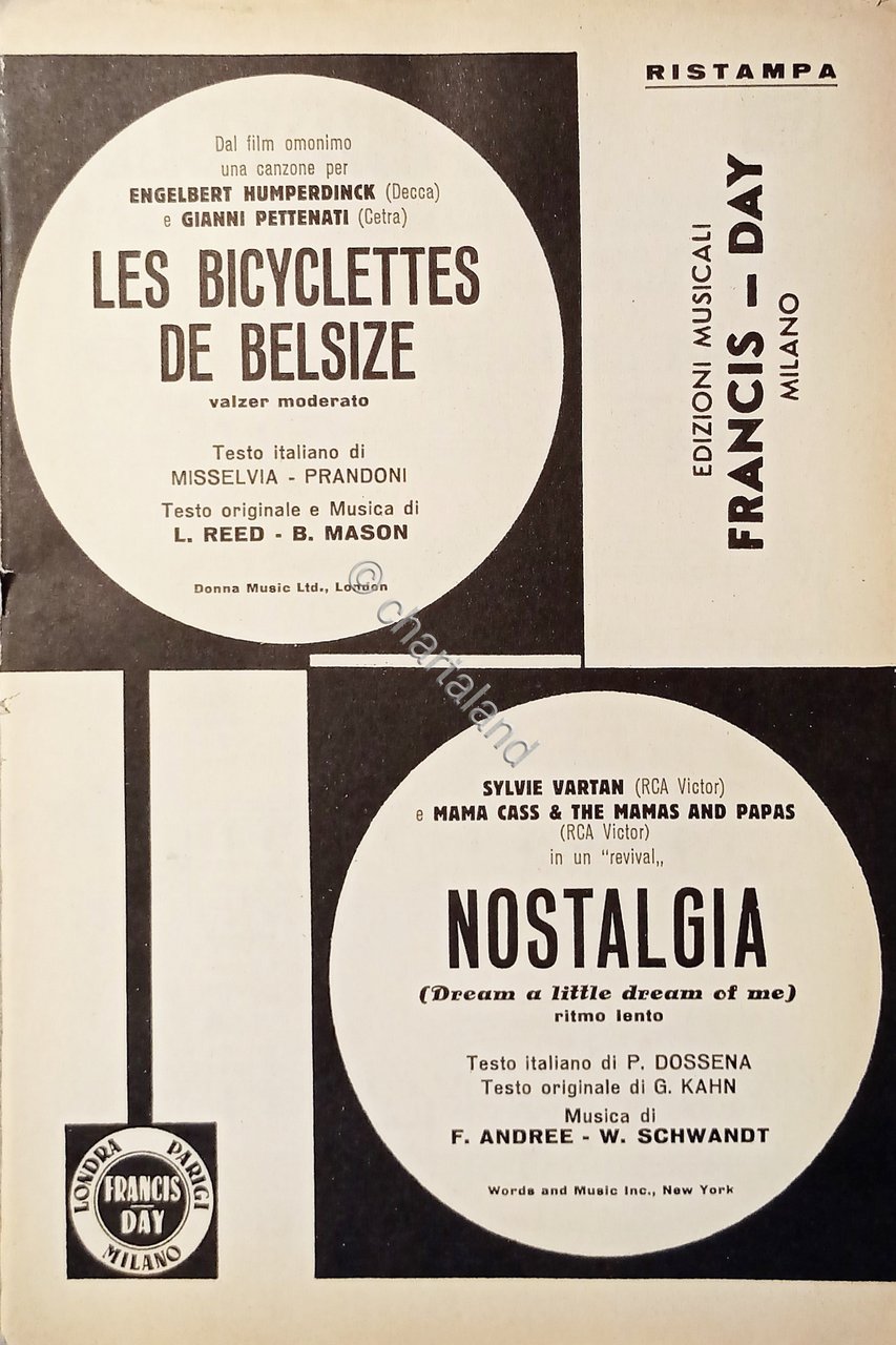 Spartiti - Les Bicyclettes de Belsize (Valzer Moderato) - Nostalgia (Ritmo Lento) - 1969 Formato piccolo. Pagine 10 Condizioni buone come da foto.