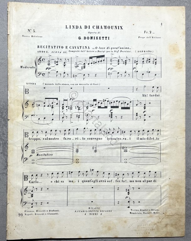 Spartiti - Linda di Chamounix - Opera di G. Donizetti - Recitativo e Cavatina