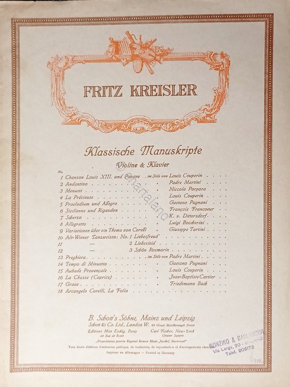 Spartiti - Siciliano per Violino e Piano di Francois Francoeur - Kreisler - 1910
