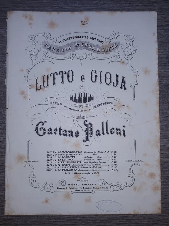 Spartito - Lutto e Gioia - Album per Pianoforte e Canto - Gaetano Palloni - № 35 - pp. 26 Copertina morbida Condizione buone come da foto