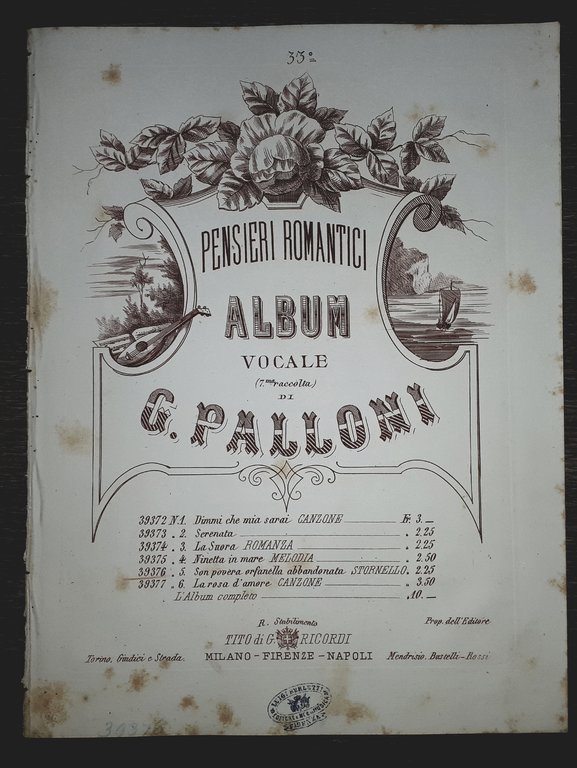 Spartito - Pensieri Romantici - Album vocale - Gaetano Palloni - Stornello - № 33 - pp. 5 Copertina morbida Condizione buone come da foto
