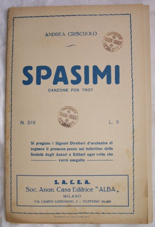 In 8. cm 27x17,5. Pp. 14. Partitura completa per orchestra del 1930 di una canzone. Caratteristica copertina decorata dell'epoca. Ex libris sulla copertina. Buone condizioni, bruniture ai margini della copertina. A complete score for orchestra of 1930. Carachteristic decorated cover of that period. Ex libris in the cover. Good conditions, yellowings in the edges of the cover.