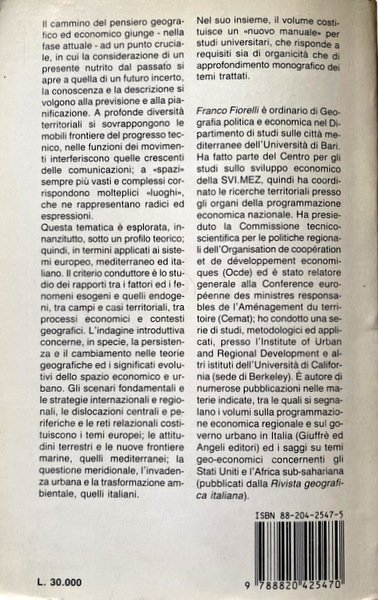 Questa tematica è esplorata, innanzitutto, sotto un profilo teorico, quindi, in termini applicati ai sistemi europeo, mediterraneo ed italiano. Il criterio conduttore è lo studio dei rapporti tra i fattori ed i fenomeni esogeni e quelli endogeni, tra campi e casi territoriali, tra processi economici e contesti geografici. L'indagine introduttiva concerne, in specie, la persistenza e il cambiamento nelle teorie geografiche ed i significati evolutivi dello spazio economico e urbano. Gli scenari fondamentali e le strategie internazionali e regionali, le dislocazioni centrali e periferiche e le reti relazionali costituiscono i temi europei; le attitudini terrestri e le nuove frontiere marine, quelli mediterranei; la questione meridionale, l'invadenza urbana e la trasformazione ambientale, quelli italiani.
