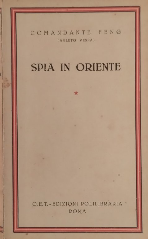 SPIA IN ORIENTE di Comandante Feng ( Amleto Vespa) O E T Edizioni Polilibraria, I edizione 1947. 357 pagine. Copertina editoriale in brossura. Stato di conservazione: molto buono (pagine normalmente ingiallite, firma di appartenenza) Chi era Amleto Vespa (Comandante Feng)Amleto Vespa (nato a L’Aquila, 1884 o 1888) fu un avventuriero, giornalista, mercenario e soprattutto una delle più misteriose e abili spie del primo Novecento. La sua vita fu segnata da continui spostamenti tra Europa, Russia, Cina e Sud America. Si arruolò, secondo alcune fonti, nell’esercito rivoluzionario messicano di Francisco Madero, ma queste vicende sono in parte avvolte nel mito e non sempre confermate da fonti ufficiali. Stabilitosi in Manciuria, divenne un personaggio chiave nel mondo dello spionaggio internazionale, lavorando per vari servizi segreti e cambiando spesso bandiera per ragioni di sopravvivenza e opportunità.Il libro Spia in OrienteTitolo originale: “Secret Agent of Japan – A Handbook to Japanese Imperialism”. Edizione italiana: “Spia in Oriente” fu pubblicato con lo pseudonimo di Comandante Feng (che in giapponese significa “vespa”), tradotto da Paolo Balbis e pubblicato da O.E.T. Edizioni Polilibraria, probabilmente nel 1947. Il libro è oggi molto raro e ricercato dai collezionisti.Contenuto: L’opera è un’autobiografia romanzata in cui Vespa racconta le sue esperienze di spionaggio in Estremo Oriente, in particolare in Manciuria e Cina, durante il periodo dell’espansione giapponese.Vespa descrive i retroscena del traffico d’armi, del contrabbando, delle lotte tra servizi segreti e delle attività delle organizzazioni criminali cinesi e giapponesi. Racconta anche il suo coinvolgimento con il potente signore della guerra Zhang Zuolin e il suo successivo passaggio al servizio dei giapponesi, sotto ricatto e minaccia alla famiglia.Temi principaliDoppio e triplo gioco: Vespa fu costantemente coinvolto in attività di spionaggio per diversi paesi, inclusi Italia, Cina, Giappone, Inghilterra e Stati Uniti.Manciuria e Manchukuo: Il libro offre una testimonianza diretta della situazione in Manciuria durante l’occupazione giapponese, delle lotte tra le varie fazioni e delle atrocità commesse.Criminalità organizzata e corruzione: Vespa descrive la vendita di monopoli su gioco d’azzardo, prostituzione e traffico di oppio come strumenti di finanziamento per l’occupazione giapponese della Cina.Testimonianza storica: Pur con elementi di leggenda e auto-mitizzazione, il libro è considerato una fonte preziosa per comprendere i retroscena meno noti della storia dell’Estremo Oriente tra le due guerre mondiali.Destino di VespaDopo essere stato smascherato nel suo doppio gioco, fu costretto a fuggire a Shanghai nel 1936. Morì in circostanze misteriose, probabilmente ucciso dai giapponesi nelle Filippine nel 1945.Libro usato saggistica