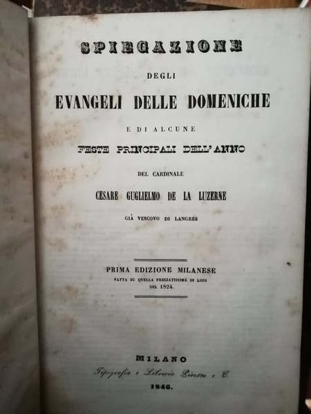 Prima edizione milanese fatta su quella di Lodi del 1824. Collana Biblioteca ecclesiastica classe terza, eloquenza, letteratura e varietà volume XX Opera del cardinale francese De La Luzerne, vescovo di Langres (1770), rappresentante del clero negli Stati Generali: quivi caldeggiò la formazione di una Camera del clero e della nobiltà separata dal Terzo Stato. Partecipò anche ai lavori della Costituente, che presiedette fino all'ag. 1789. Avversò energicamente la costituzione civile del clero e, costretto ad abbandonare la diocesi, si rifugiò in Svizzera, Austria e Italia. Il volume costituisce una raccolta delle sue omelie domenicali e per le feste principali dell'anno. Copertina cartonata. Pp. 558. Buone condizioni.