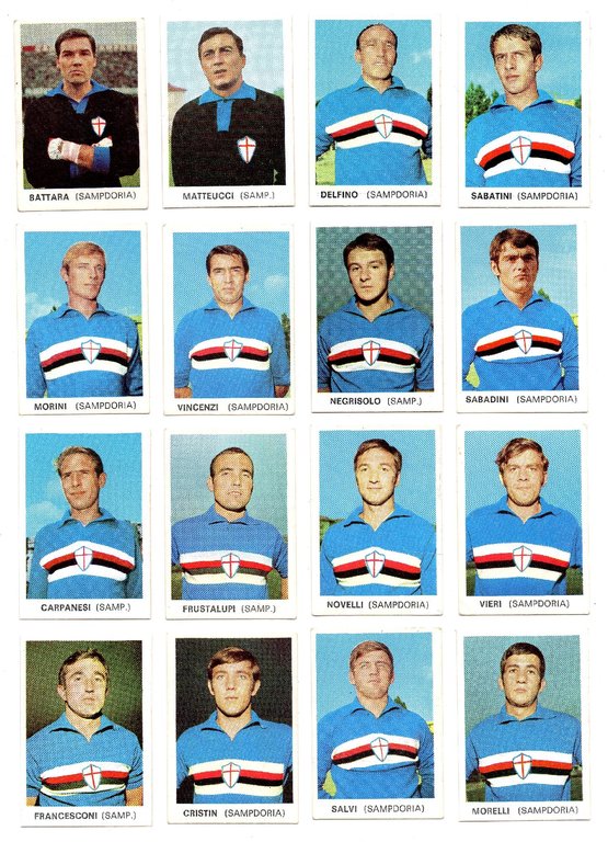 Squadra completa di 16 Figurine - Sampdoria 1968-69. Edizioni Edis - Torino. Prima collezione calcistica della Edis che non prevedeva l'Album ma un contenitore. Nuove, Da Edicola! , Perfetto (Mint)
