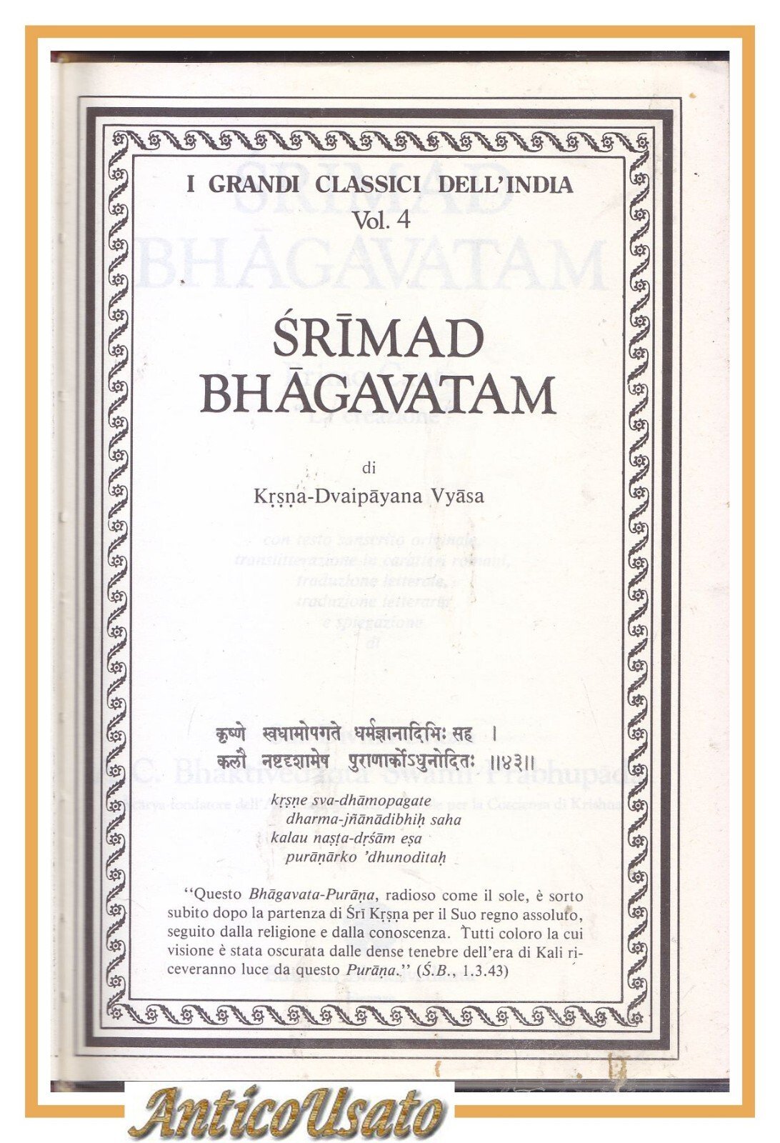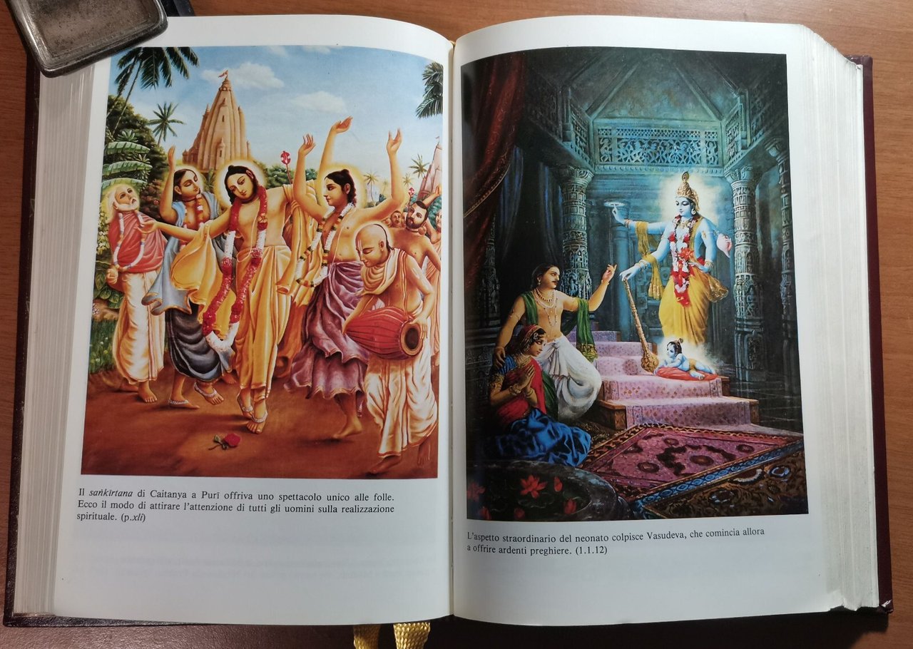 Testo sanscrito originale, translitterazione in caratteri romani, traduzione letterale e letteraria e spiegazione. Edizioni Bhaktivedanda, Classici dell'India 1981. L, 1063 pagine, illustrazioni a colori fuori testo. Elegante copertina editoriale in finta pelle con fregi e scritte dorati al piatto e al dorso. stato di conservazione: molto buono (pagine normalmente ingiallite)
