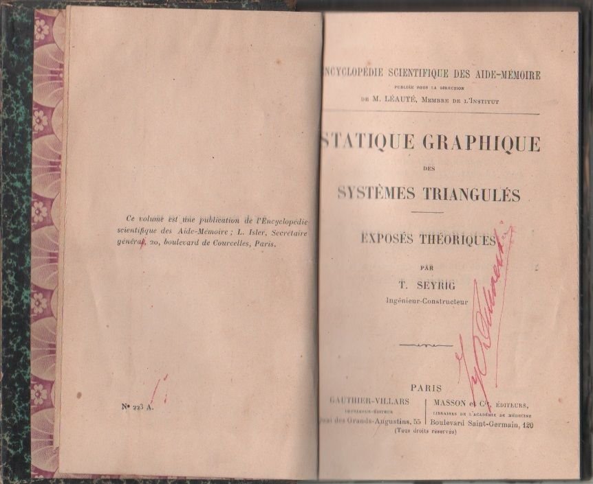 Statique graphique des systèmes triangulés . Exposés théoriquesIl volume fa parte dell'Encyclopédie scientifique des aide-mémoire curata da M. Léauté, vol. n° 223A. In 16°; pp. 141+XXI tavole f.t.; mezza pelle; nervature al dorso bella sguardia d'epoca; abrasioni e tracce d'uso alla copertina; firma d'appartenenza al frontespizio; rare sottolineature a matita nel testo; buono stato.14B-11