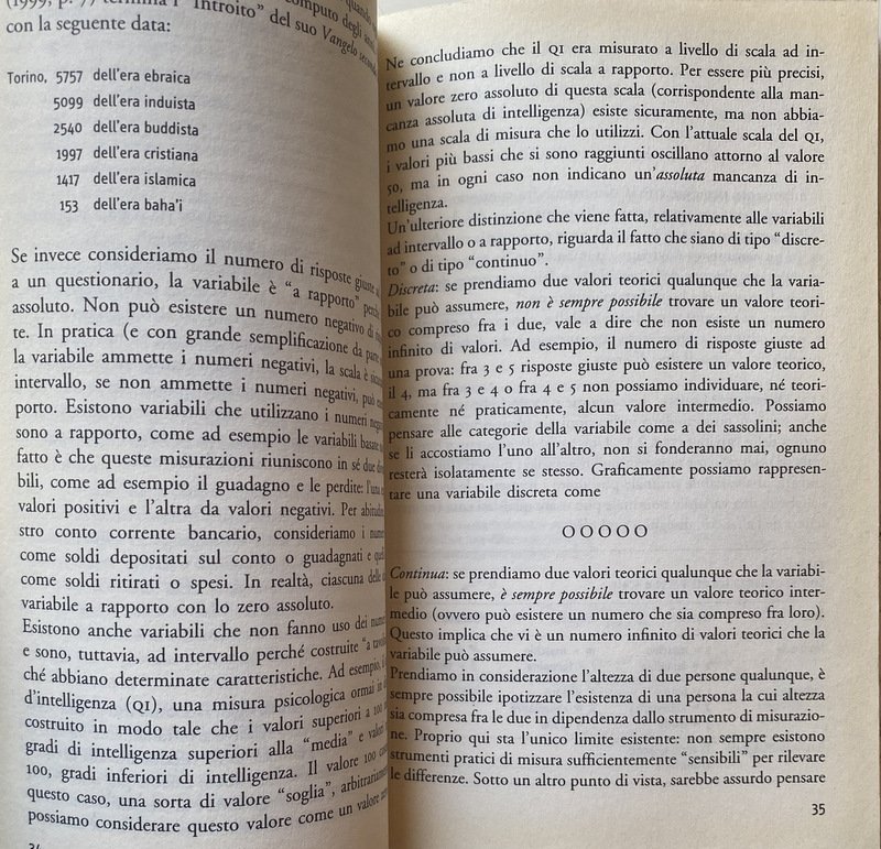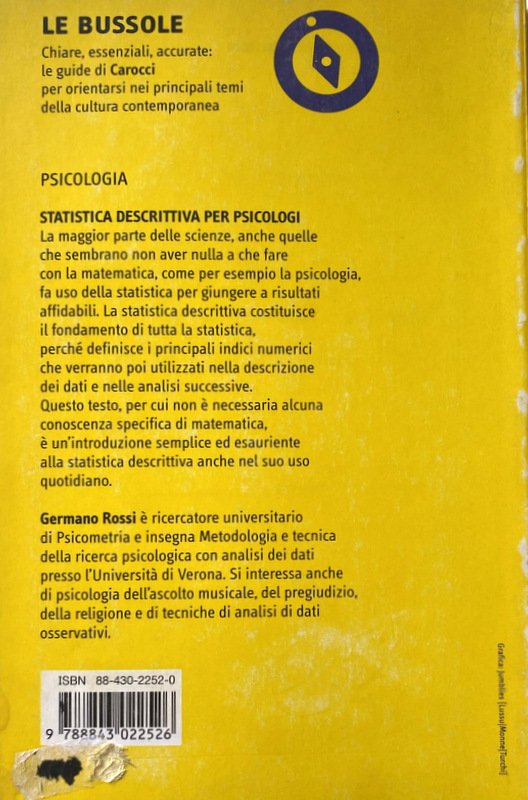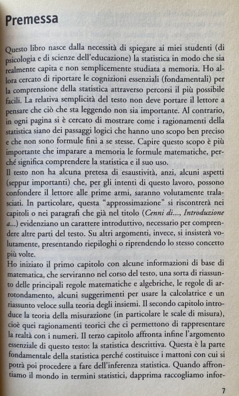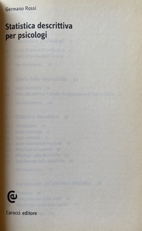 Soggetti: Psicometria, Metodologia, Ricerca psicologica, Metodologie, Test, Società, Scienze sociali applicate, Educazione, Formazione professionale, Psicologia, Statistica descrittiva, Analisi, Teorie, Insiemi, Gruppi, Dati, Calcolo, Matematica, Guide pratiche, Manuali, Vita quotidiana, Uso, Utilizzo, Università, Parametri Scale, Rapporti, Variabili, Significato, Inferenza, Misurazioni, Numeri, Grafici, Tabelle, Media, Bibliografia, Riferimento, Libri fuori catalogo, Logica, Terminologia, Relazioni, Dipendenze, Indici statistici, Dimostrazioni, Risultati, Operazioni, Aritmetica, Distribuzioni di frequenza, Problemi, Posizioni, Quartili, Equivalenze, Indici, Mediana, Rappresentazione grafica, Grafico a torta, Errori, Percentuali, Ascisse, Ordinate, Termini, Scienza, Induttiva, Inferenze, Likert, Esempi, Matrici inverse generalizzate, Applicazioni, Interpolazione lineare, Tendenza, Dispersione, Grafico cartesiano, Moda, Classe, Possibilità, Probabilità, Previsioni, Uguaglianze, Roberto Prisco, Trucchi, Truccati, Ipotesi, Standard, Valori, Limiti, Comportamento, Questionario, Identità, Studenti, Popolazione, Parametri, Campionamento, Campioni, Costanti, Runyon, Haber, Zuliani, Cristante, Lis, Sabin, Piergiorgio Corbetta, Giancarlo Gasperoni, Maurizio Pisati Cohen, Holliday, M. Alietti, G. Rossi, Piergiorgio Odifreddi, A.M. Manganelli Rattazzi, L. Cottini, E.W. Minium, R.C. Clarke, T. Coladarci, Psychometrics, Methodology, Psychological research, Methodologies, Society, Applied social sciences, Education, Professional training, Psychology, Descriptive statistics, Analysis, Theories, Sets, Groups, Data, Calculation, Mathematics, Practical guides, Manuals, Daily life, Use, Usage, University, Parameters Scales, Ratios, Variables, Meaning, Inference, Measurements, Numbers, Graphs, Tables, Average, Bibliography, Reference, Discontinued books, Terminology, Relations, Dependencies, Statistical indices, Demonstrations, Results, Operations, Arithmetic, Distributions frequency, Problems, Positions, Quartiles, Equivalences, Indices, Median, Graphical representation, Pie chart, Errors, Percentages, Abscissa, Ordinate, Terms, Science, Inductive, Inferences, Examples, Generalized inverse matrices, Applications, Linear interpolation, Trend, Dispersion, Cartesian graph, Fashion, Class, Possibility, Probability, Forecasts, Equalities, Tricks, Hypothesis, Values, Limits, Behaviour, Questionnaire, Identity, Students, Population, Parameters, Sampling, Samples, Constants