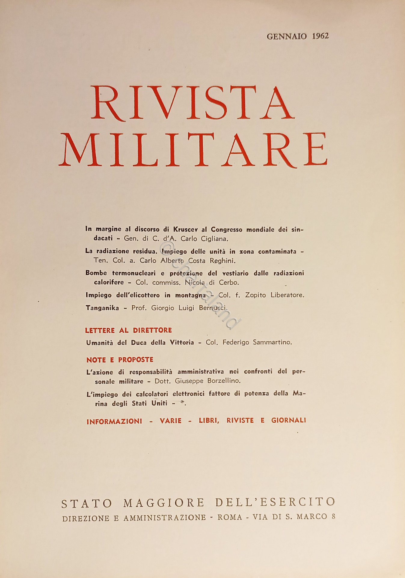Stato Maggiore dell'Esercito - Rivista Militare - Gennaio 1962