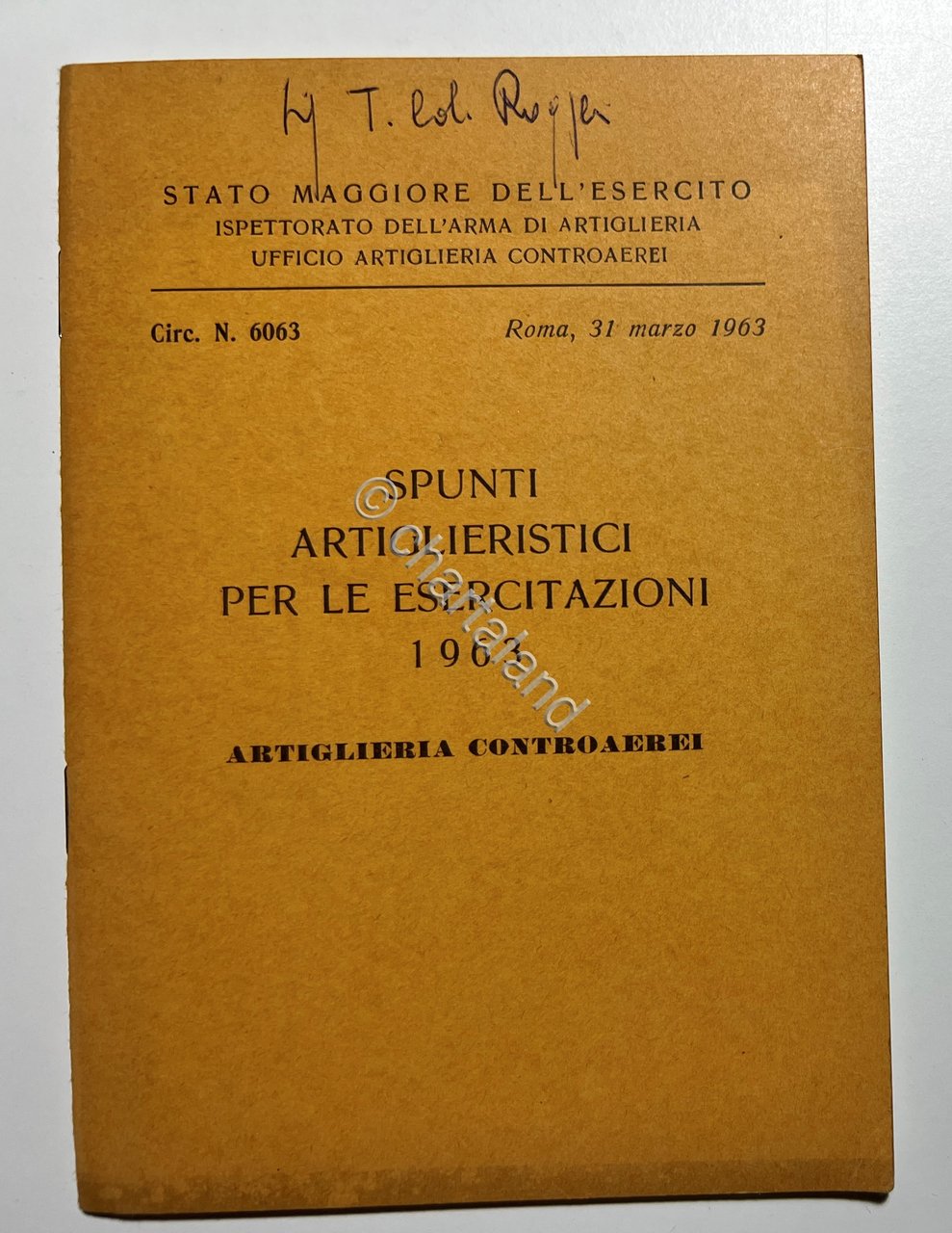 Stato Maggiore dell'Esercito - Spunti Artiglieristici per le Esercitazioni - ed. 1963 Testo in lingua italiana. Pagine 30 con 1 tavole ripiegata. Copertina morbida. Condizioni molto buone.