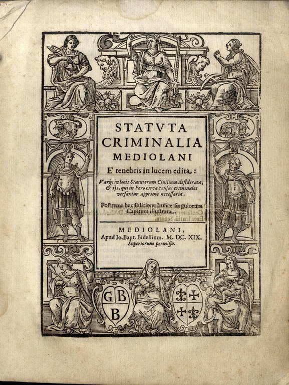Statuta criminalia mediolani e tenebris in lucem edita: varijs in locis Statutorum Ciuilium desiderata; & ijs, qui in Foro circa causas criminales versantur apprime necessaria. Postrema hac editione indice singulorum capitum illustrata.