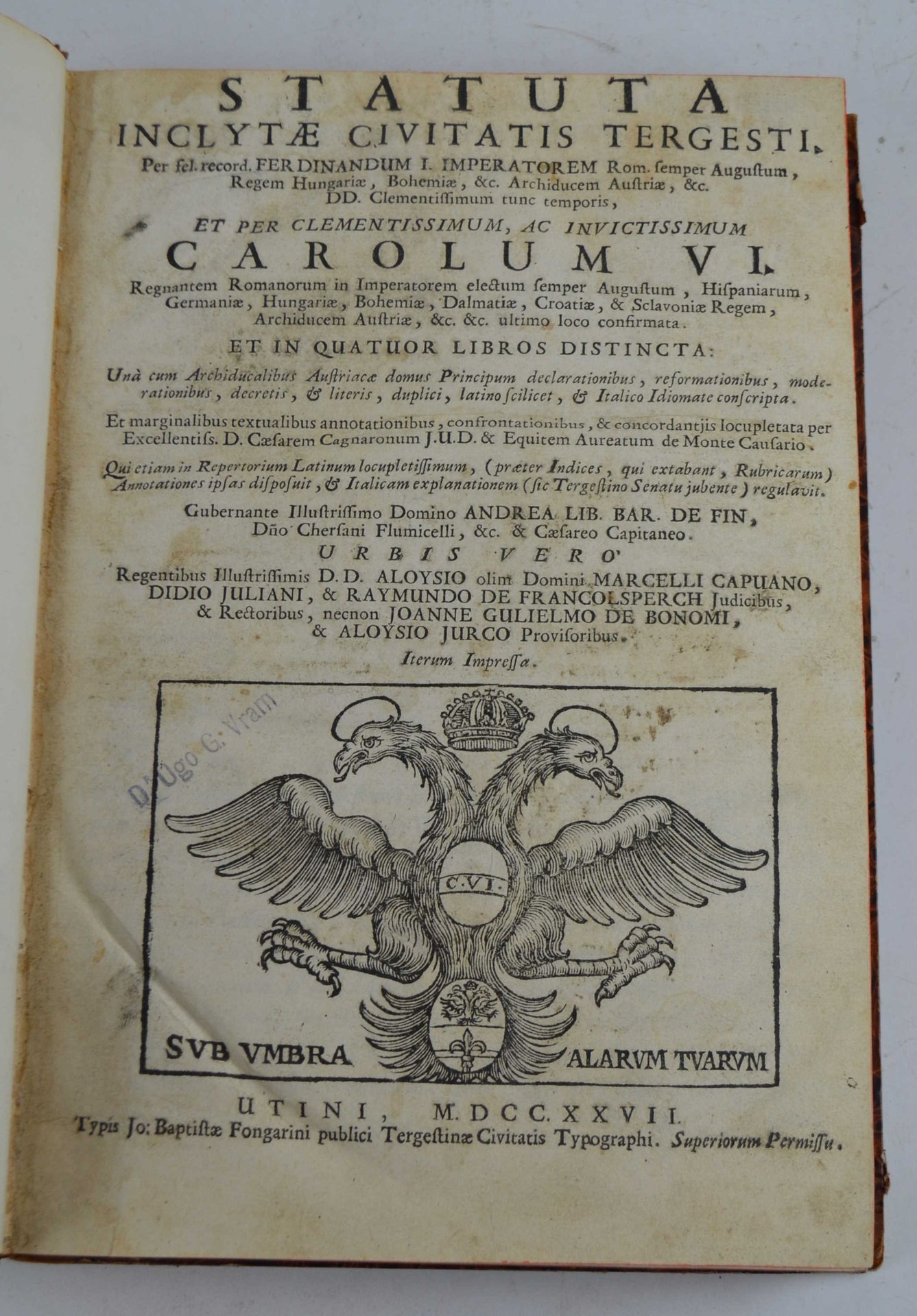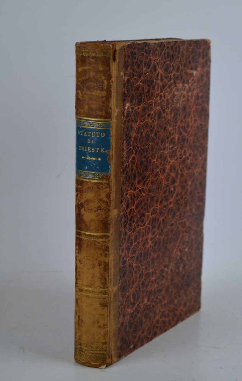 Pp. 384 (40). Con grande stemma al frontespizio e bei capolettera istoriati. Unito a: Cesarea regia sovrana risoluzione normale sopra lo statuto della città di Trieste in materia di giustizia emanata li 18. maggio 1767. Wien, Edlen von Trattnern, s.a. (1767 ca.). Pp. 111 (1). Testo tedesco e traduzione italiana a fronte. Due opere legate in un volume di cm. 28. Legatura ottocentesca in mezza pelle, dorso liscio con filetti in oro e titoli su tassello. Dorso un po' liso, margini sobri ed un timbretto privato di possesso al frontespizio del primo volume (Dr. Ugo Vram). Complessivamente ben conservato. Non comune edizione degli statuti di Trieste, la seconda a stampa dopo quella del 1625. Cfr. Fontana III, 200-201. Il secondo testo, da p. 43, con autonomo frontespizio, contiene anche il testo: Norma del ordine giudiziale per i processi litigiosi.