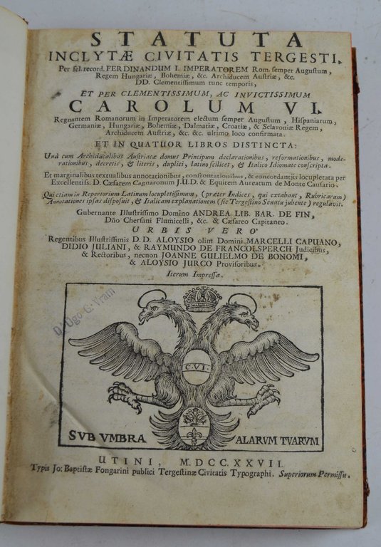 Statuta inclytæ civitatis Tergesti. in quatuor libros distincta: unà cum Archiducalibus Austriacæ domus Principum declarationibus, reformationibus, moderationibus, decretis, & literis, duplici, latino scilicet, & italico idiomate conscripta. Et marginalibus textualibus annotationibus.