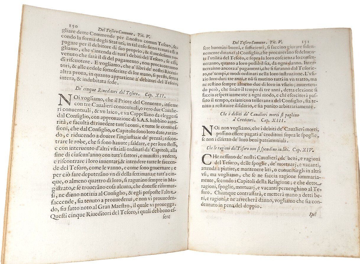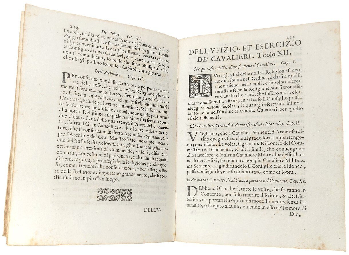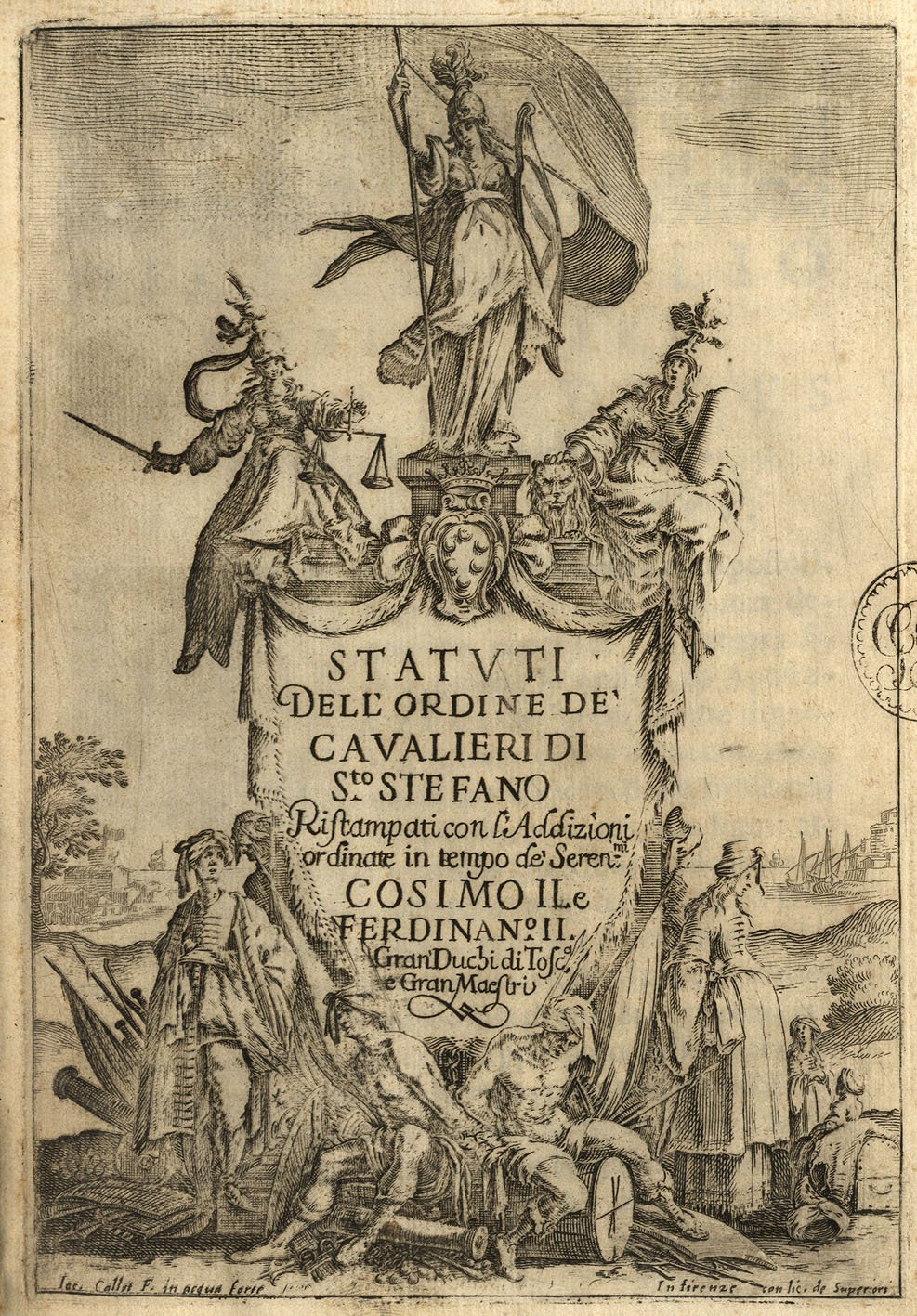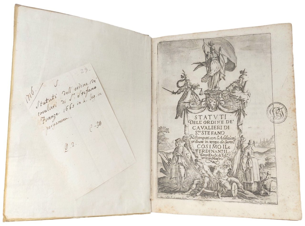 >in-4 (226x160mm), pp. 316, legatura coeva p. pergamena, titolo ms. al dorso. Magnifico frontespizio disegnato ed inciso all'acquaforte da J. CALLOT raffigurante un monumento con tre figure femminili e le armi dei Medici in alto, il titolo dell'opera al centro e schiavi turchi incatenati ed altri personaggi, armi e trofei in basso. Grandi iniziali e fregi silografici, testo in carattere tondo. Precedono vari documenti dei Papi Pio IV, Sisto V e Pio V e della Sacra Rota in favore dei Medici e dei Cavalieri di S. Stefano. Pregevole edizione, con le aggiunte fino al 1665, degli ''Statuti'' dei Cavalieri di S. Stefano, Ordine fondato dal Granduca Cosimo I Medici nel 1562 per la difesa del commercio dai pirati barbareschi. Ottimo esemplare (piccolo antico timbro di collezionista nel margine del titolo). Cfr. Lieure, J. Callot, vol. V, n. 372. Razzolini p. 325. Moreni II, 402, note.