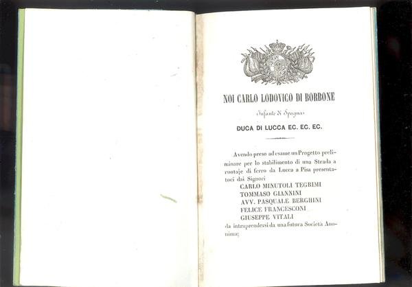 IN 8°, OPERA DIVISA IN DUE PARTI: 1) DA pg.1.a pg.14, MOTU - PROPRIO DI CARLO LUDOVICO DI BORBONE INFANTE DI SPAGNA DUCA DI LUCCA EC. SULL'APPROVAZIONE DELLA SOCIETA' ANONIMA PER LA COSTRUZIONE DEL TRONCONE FERROVIARIO DA LUCCA AL CONFINE LUCCHESE DI CERASOMMA. 2) DA pg.14 a pg.41, STATUTI DIVISI IN 61 ARTICOLI SEGNATI DA: CARLO MINUTOLI TEGRIMI, TOMMASO GIANNINI, AVV. PASQUALE BERGHINI, FELICE FRANCESCONI, GIUSEPPE VITALI. LE DUE TESTATINE SONO FIGURATE CON STEMMI INCISI.<BR>COPERTINA MUTA . RARA PLACCHETTA SULLA PRIMA FERROVIA INTERNAZIONALE ( DUCATO<BR>DI LUCCA - GRANDUCATO DI TOSCANA ). OTTIMA CONSERVAZIONE. ID, 6265