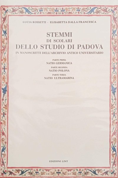 PRIMA EDIZIONE edito per cura della cassa di risparmio di Padova e Rovigo Gli stemmi rappresentati e descritti in questo volume sono tratti dai manoscritti delle nationes alemanna, polacca ed oltremarina, conservati presso l'Archivio Antico dell'Università di Padova e si riferiscono a studenti che frequentarono l'Universitas iuristarum e l'ìUniversitas artistarum nel corso dei secoli XVI, XVII, XVIII. Il volume è corredato da suggestive immagini policrome di stemmi miniati; la prima parte è dedicata alla Natio germanica, la seconda alla Natio polona, la terza alla natio ultramarina. Cartonato con sovraccoperta illustrata e di acetato in cofanetto di cartone. Pp. 388. Pari al nuovo.