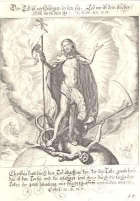 Christus triumphans. Blattgrösse 24,8 x 17,9 cm; Plattengrösse 15,2 x 10,8 cm, auf festem Papier. Massmann, S. 51. Leemann-van Elck, S 114. Faber du Faur S. 454. Lonchamp 2073. - 61 ganzs. Kupferstiche umfasst die Folge. "Dieser Totentanz ist ein Gipfelpunkt züricherischer Illustrationskunst" (Leemann-van Elck, S 115). - Radierung von der Original-Platte. - Ränder etwas unfrisch. - The indicated shipping costs refer to books weighing up to one kilogram. - Bücher, die schwerer als ein Kilogramm oder größer als 35 x 25 cm sind, werden als Paket verschickt und kosten innerhalb Deutschlands bis zu zwei Kilogramm 6 Euro, darüber hinaus 7 Euro Porto. -