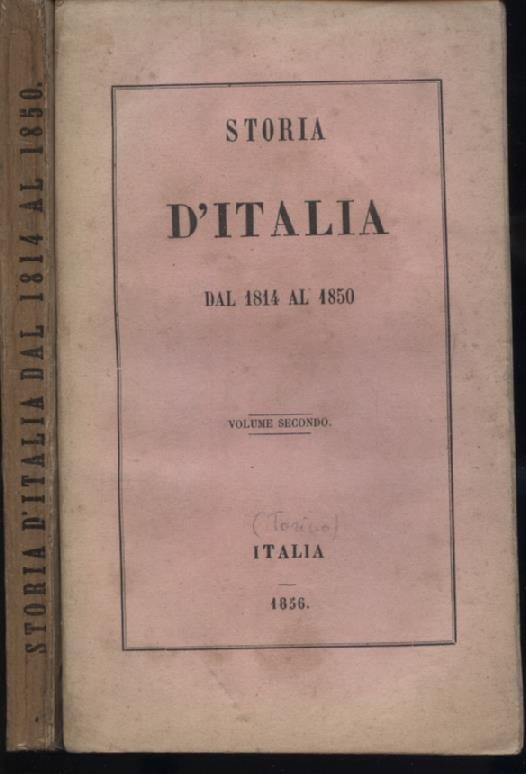 2 volumi in-8°, pp. VII, 352, (4); 367, (5); brossura editoriale rosa pallido con titolo entro filetto. Bell'esemplare. Prima edizione, rara, impressa anonimamente, ma dovuta alla penna di Luigi Anelli, di questo tentativo di storia d'Italia dal Congresso di Vienna al 1850 improntato a schietti spiriti repubblicani e federalisti. Scrive Marino Parenti: 'La prefazione è firmata Sancho Abarca e comp. e il Bertarelli (l'editore) non sospetta che si tratti di pseudonimo e lo indica come autore. L'opera invece, rarissima, è di Luigi Anelli. Quanto al luogo di stampa è chiaramente indicato alla fine di ciascun volume'. L'Anelli (Lodi 1813-Milano, 1890) 'letterato, sacerdote, membro del Governo Provvisorio durante le Cinque Giornate, al ritorno degli austriaci si rifugiò a Nizza e tornò in patria nel 1859. Buon traduttore di classici, la sua opera principale è la Storia d'Italia dal 1815 al 1867, dedicata a Giuseppe Ferrari, la cui edizione definitiva uscì in Milano tra il 1864 e il 1868'. Parenti, Dizionario dei luoghi di stampa falsi, p. 231. Parenti, Rarità, III, 110. Lemmi, p.110. Bertarelli, n. 9330. Rosi, II, 70. Ghisalberti, I,13 e II, 660: 'Rappresenta la voce del repubblicanesimo intransigente'. Franco Della Peruta in D.B.I., III, 1961: 'Dopo il ritorno degli Austriaci a Milano l'Anelli (che rimase nella città lombarda fino all'ultimo, per tentare di suscitarvi un'ultima resistenza) si recò in esilio a Nizza, dove si fermò fino al 1859, tenendosi lontano dalla politica militante e dedicandosi prevalentemente agli studi storici. In quegli anni lavorò in particolare ad una Storia d'Italia dal 1814 al 1850 (2 voll., Torino 1856), ampia ed onesta compilazione, condotta con tono moraleggiante e stile tacitiano, ammata però da ung viva passione politica e dai suoi ideali democratici, sinceramente vissuti: il 'progresso', come legge 'inflessibile' dell'umanità; la libertà, principio della vita dei popoli e ragione di ogni fatto politico; il popolo, elemento attivo da educare alla vita politica. In due successive edizioni (4 voll., Milano 1864; 6 voll., ibid. 1868), in cui la narrazione è condotta rispettivamente fino al 1863 ed al 1867, risultano accentuati i motivi polemici antipiemontesi e antimoderati e la coloritura repubblicana dell'opera.'.