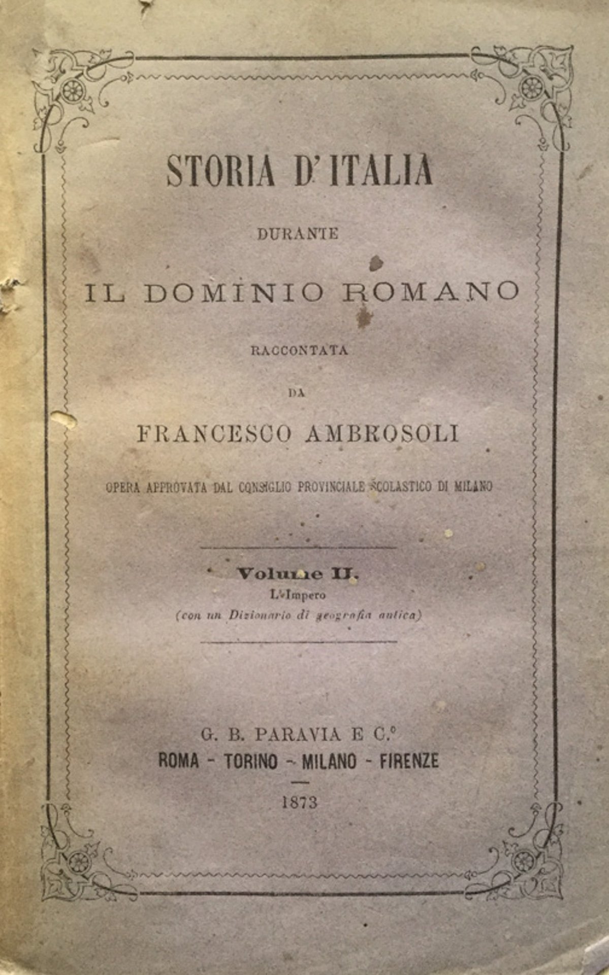 Roma, Paravia, 1873, in 16mo. Brossura editoriale, 290 pp. Con un dizionario di geografia antica. In Sedicesimi (10-17cm ) Mediocre (Poor) Accettabile