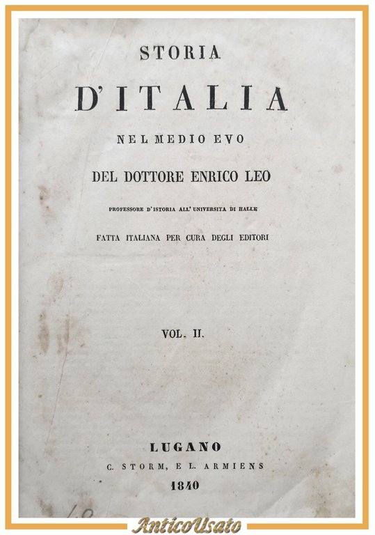 STORIA D'ITALIA NEL MEDIOEVO di Enrico Leo volume II 1840 Storm e Armiens Libro