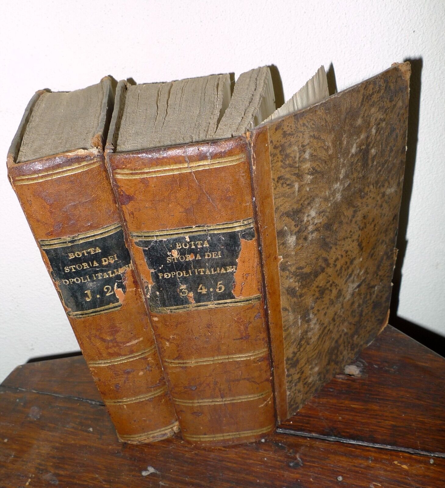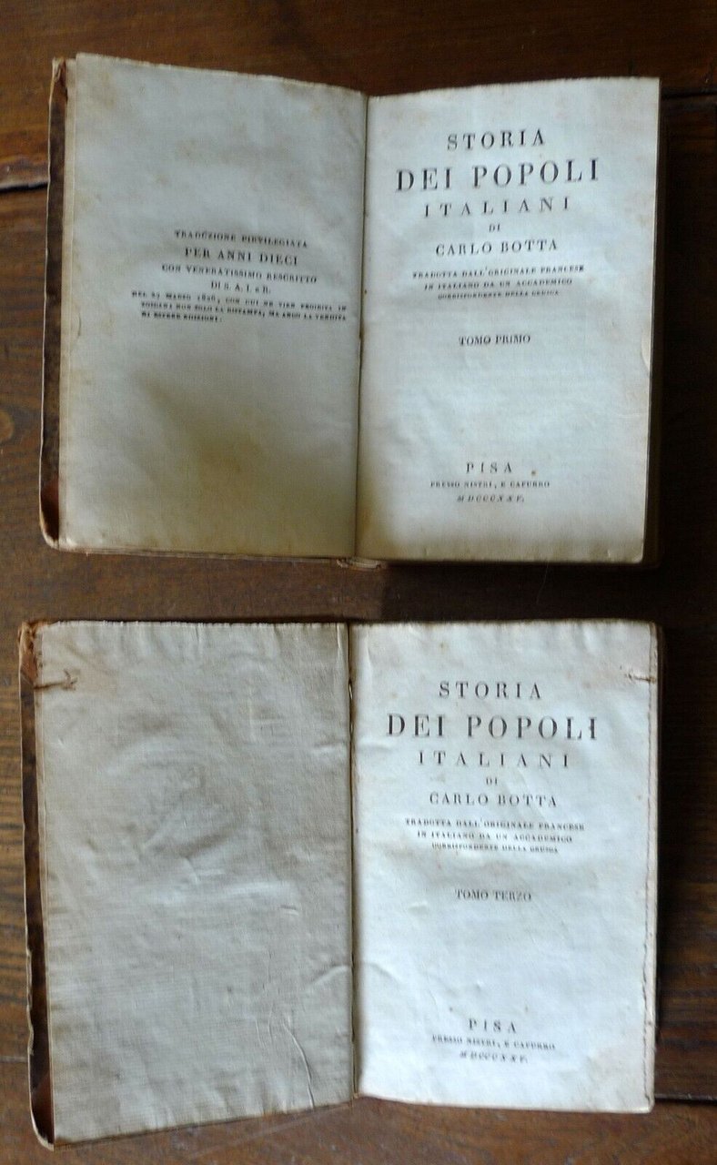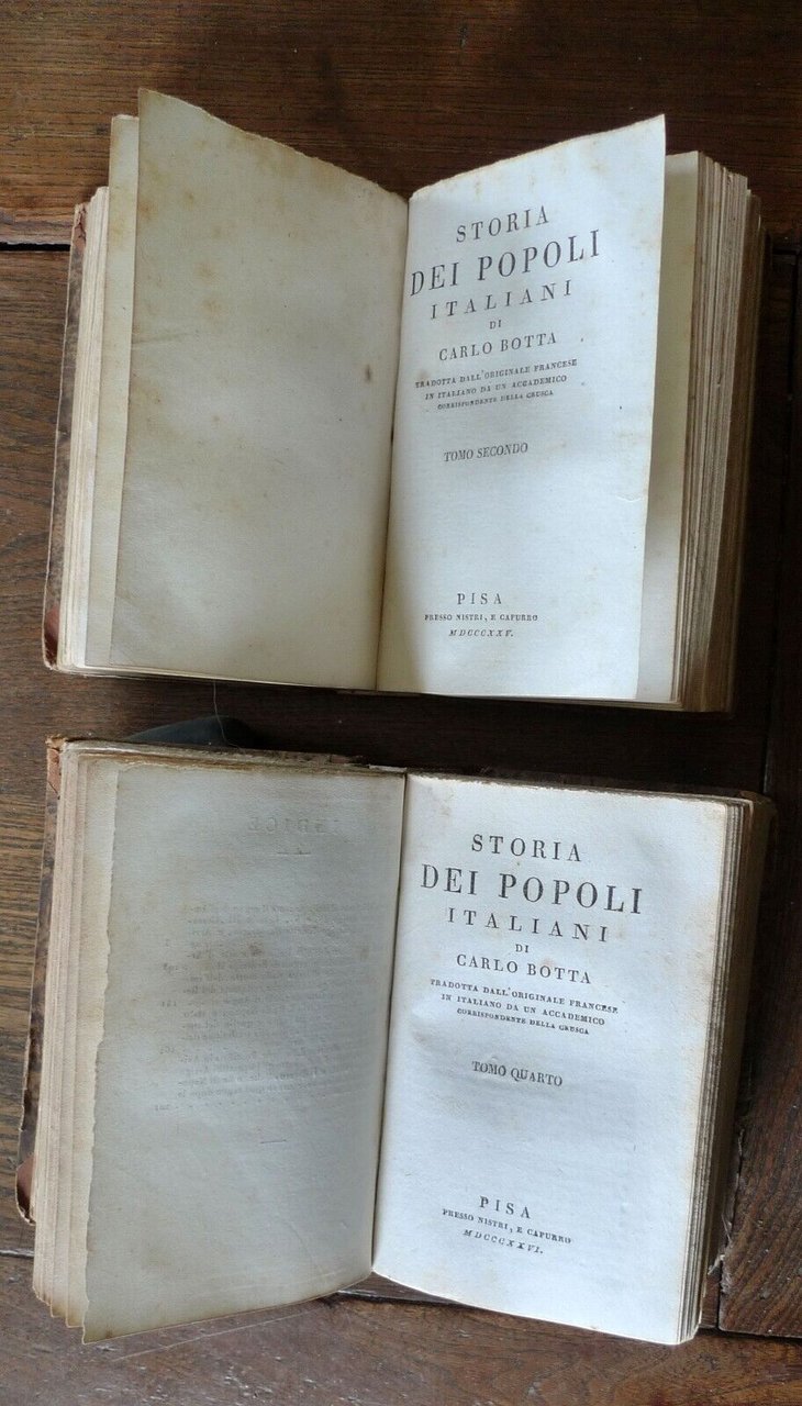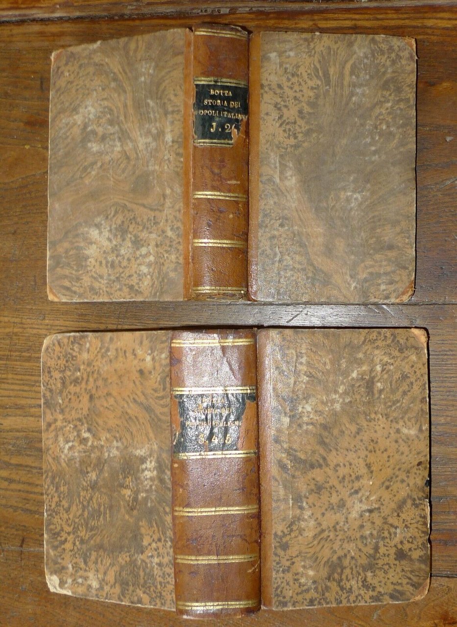 STORIA DEI POPOLI ITALIANIDI CARLO BOTTATRADOTTA DALL'ORIGINALE FRANCESEIN ITALIANO DA UN ACCADEMICOCORRISPONDENTE DELLA CRUSCA.TOMO PRIMOTOMO SECONDOTOMO TERZOTOMO QUARTOTOMO QUINTO a cui si è aggiunto un opuscolo dell'Autoresul carattere degli storici italiani, e la suarisposta a Paradisi e Lucchesini.[5 TOMI RILEGATI IN 2 VOLUMI,OPERA COMPLETA]PISA, presso Nistri, e Capurro, MDCCCXXV, MDCCCXXVI (1825-1826),copertina rigida, rilegatura coeva in mezza pelle,15,5x10 cm., pp.VII-217; 215; 218; 221; 227,peso: g.800