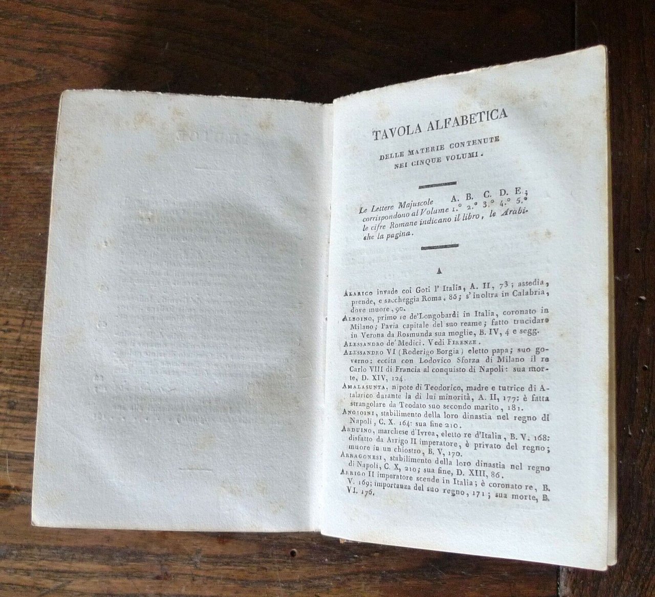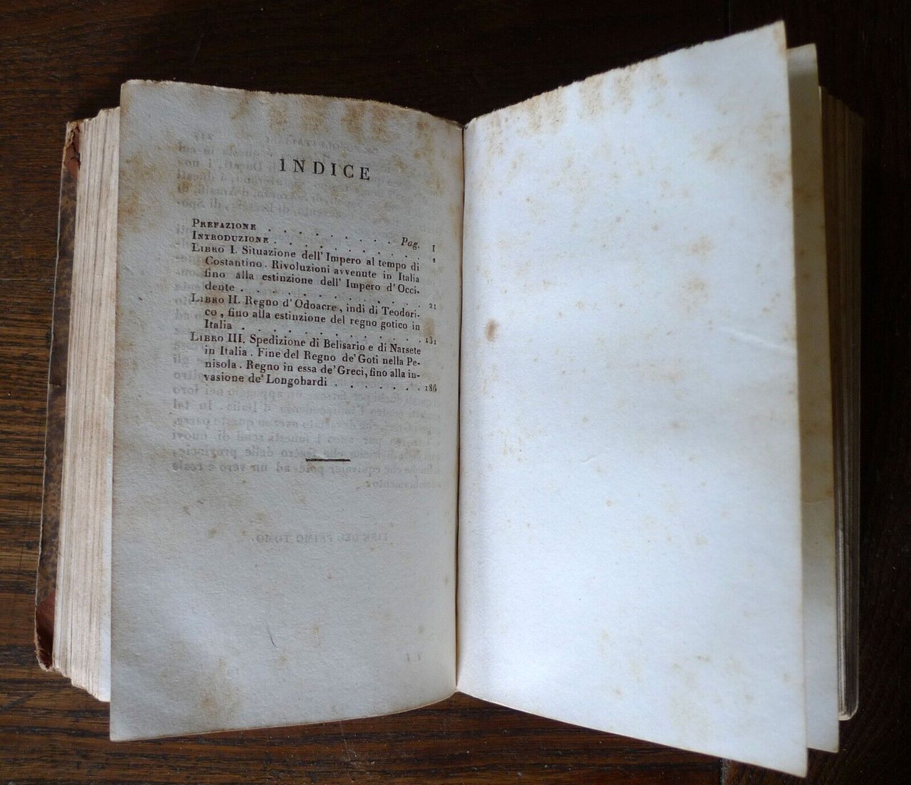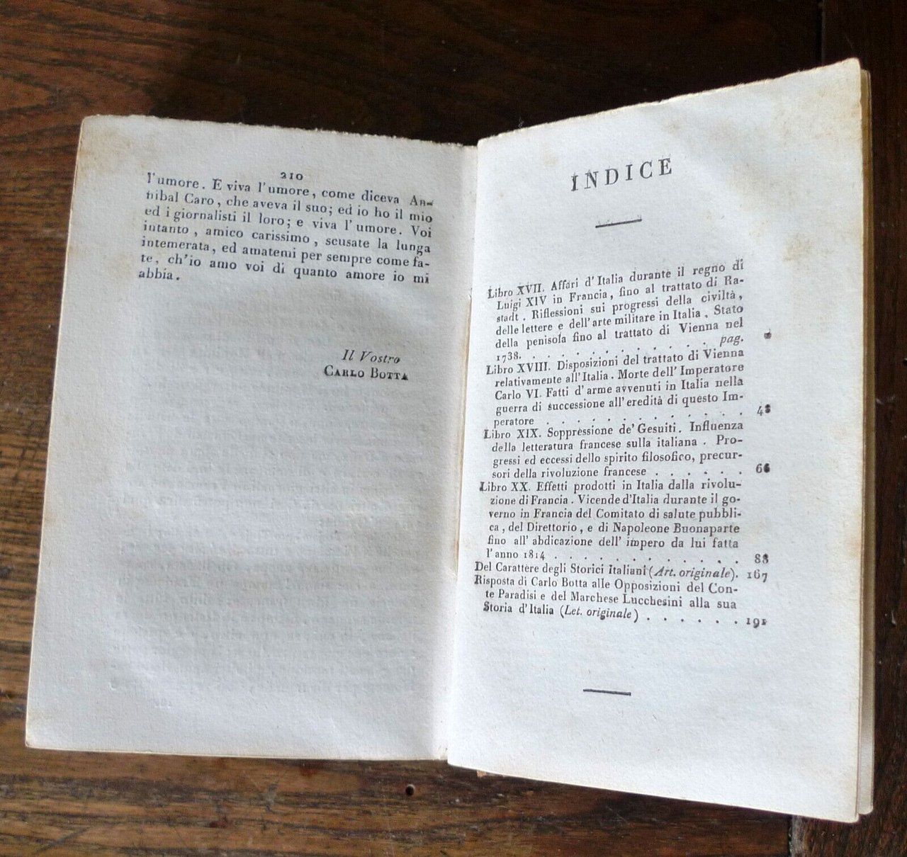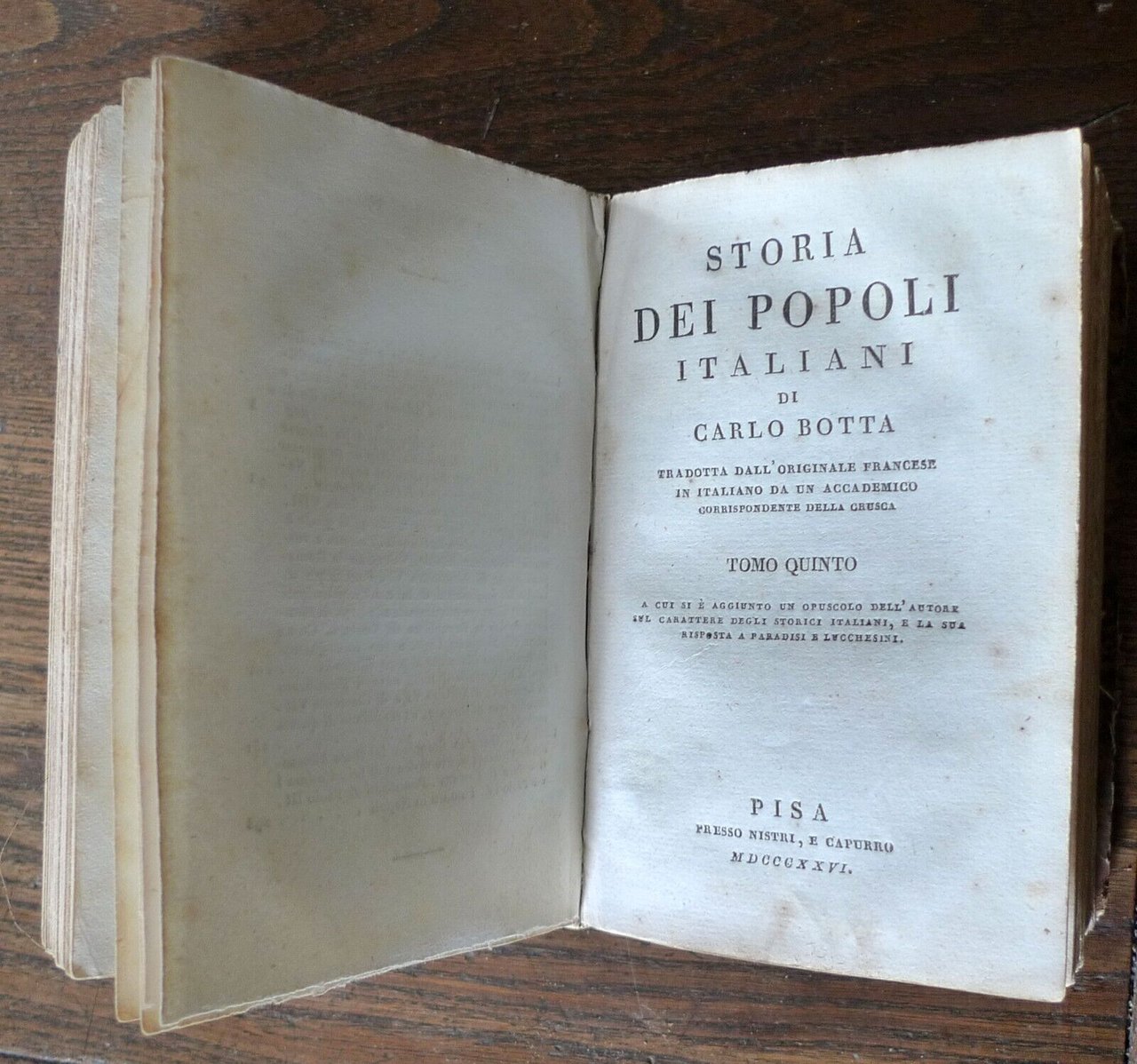 STORIA DEI POPOLI ITALIANIDI CARLO BOTTATRADOTTA DALL'ORIGINALE FRANCESEIN ITALIANO DA UN ACCADEMICOCORRISPONDENTE DELLA CRUSCA.TOMO PRIMOTOMO SECONDOTOMO TERZOTOMO QUARTOTOMO QUINTO a cui si è aggiunto un opuscolo dell'Autoresul carattere degli storici italiani, e la suarisposta a Paradisi e Lucchesini.[5 TOMI RILEGATI IN 2 VOLUMI,OPERA COMPLETA]PISA, presso Nistri, e Capurro, MDCCCXXV, MDCCCXXVI (1825-1826),copertina rigida, rilegatura coeva in mezza pelle,15,5x10 cm., pp.VII-217; 215; 218; 221; 227,peso: g.800